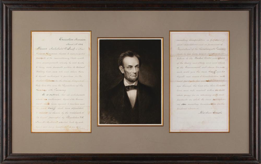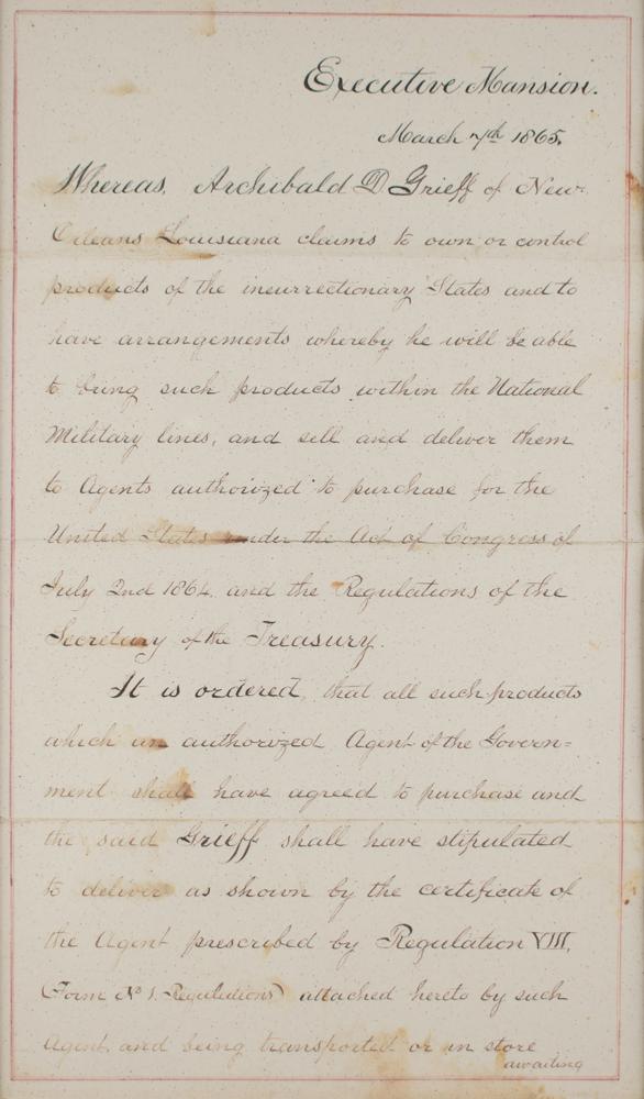 Important manuscript DS as president, two pages, 7.75 x 13.25, March 7, 1865. Significant document issued from the Executive Mansion, permitting trade across military lines during the Civil War. In part: "Where Archibald D. Grieff of New Orleans, Louisiana, claims to own or control products of the insurrectionary states and to have arrangements whereby he will be able to bring such products within the national military lines, and sell and deliver them to agents authorized to purchase for the United States under the act of Congress of July 2, 1864, and the regulations of the Secretary of the Treasury; It is ordered that all such products which an authorized agent of the government shall have agreed to purchase and the said Grieff shall have stipulated to deliver as shown by the certificate of the agent prescribed by Regulation VIII?