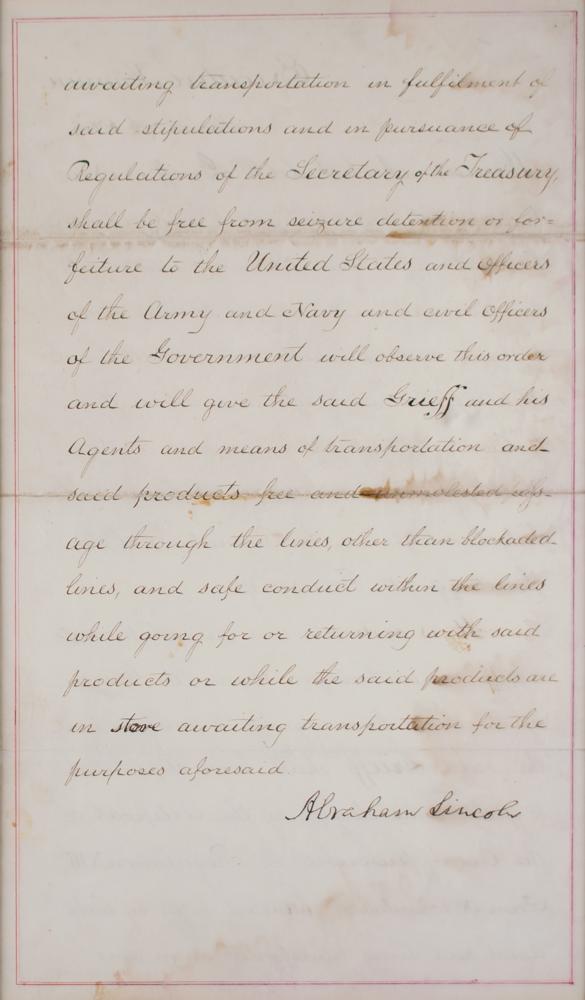 And being transported or in store awaiting transportation in fulfillment of said stipulations and in pursuance of regulations of the Secretary of the Treasury, shall be free from seizure, detention or forfeiture to the United States, and officers of the army and navy and civil officers of the government will observe this order and will give the said Grieff and his agents and means of transportation and said products free and unmolested passage through the lines, other than blockaded lines, and safe contact within the lines while going for or returning with said products or while the said products are in store awaiting transportation for the purposes aforesaid." In fine condition, with scattered staining.