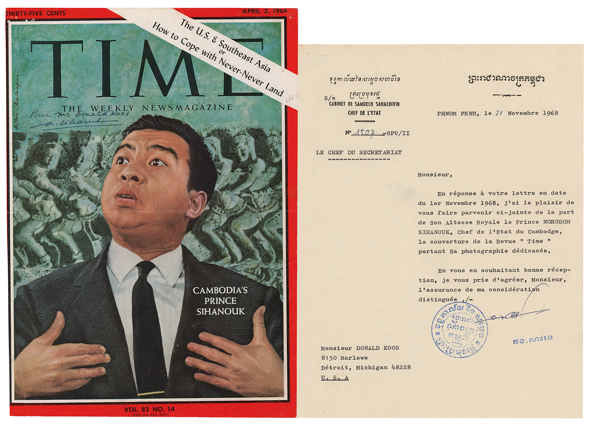 Cambodian leader (1922-2012) who served under several different titles between 1941 and 2005, including two terms as king. Time Magazine cover from the April 3, 1964 issue, 7.5 x 10.75, signed and inscribed in blue ink, "Pour Mr. Donald Koos, N. Sihanouk." In very good to fine condition, with trimmed edges, tack holes to the top corners, and a central horizontal fold. Accompanied by the original transmittal letter from his office, dated November 21, 1968.