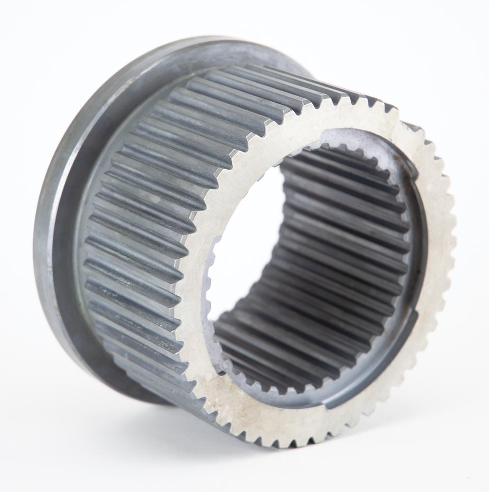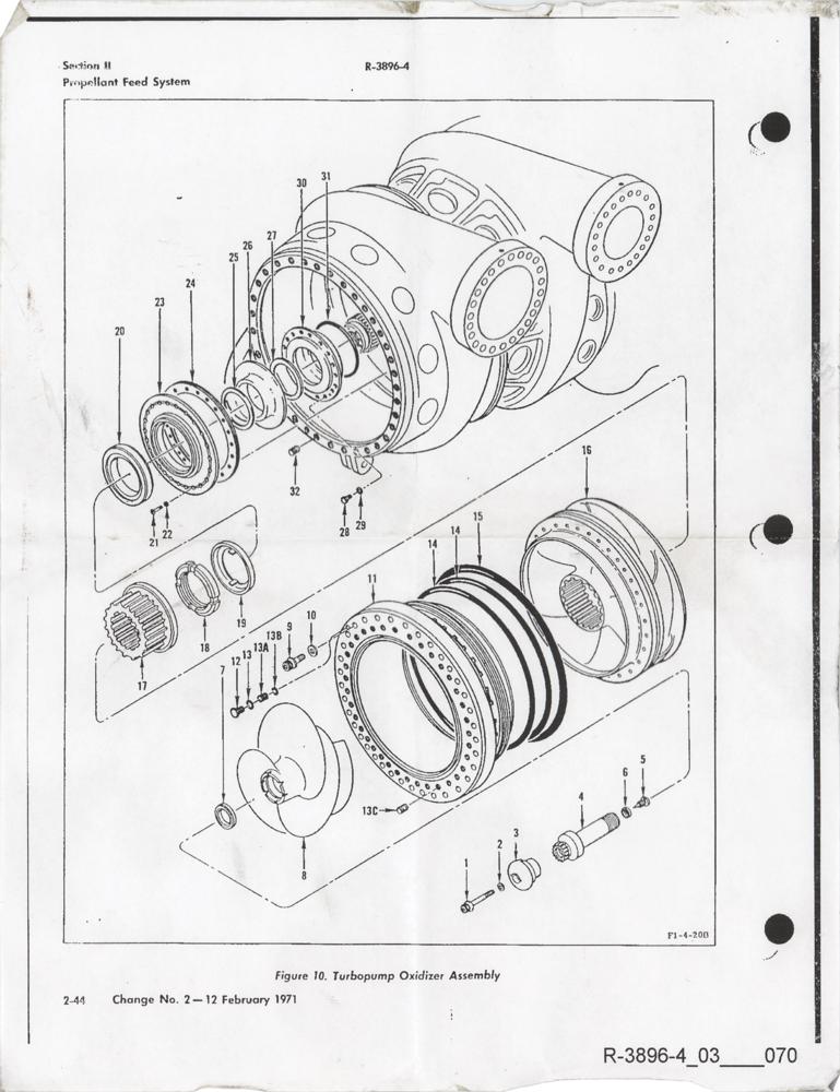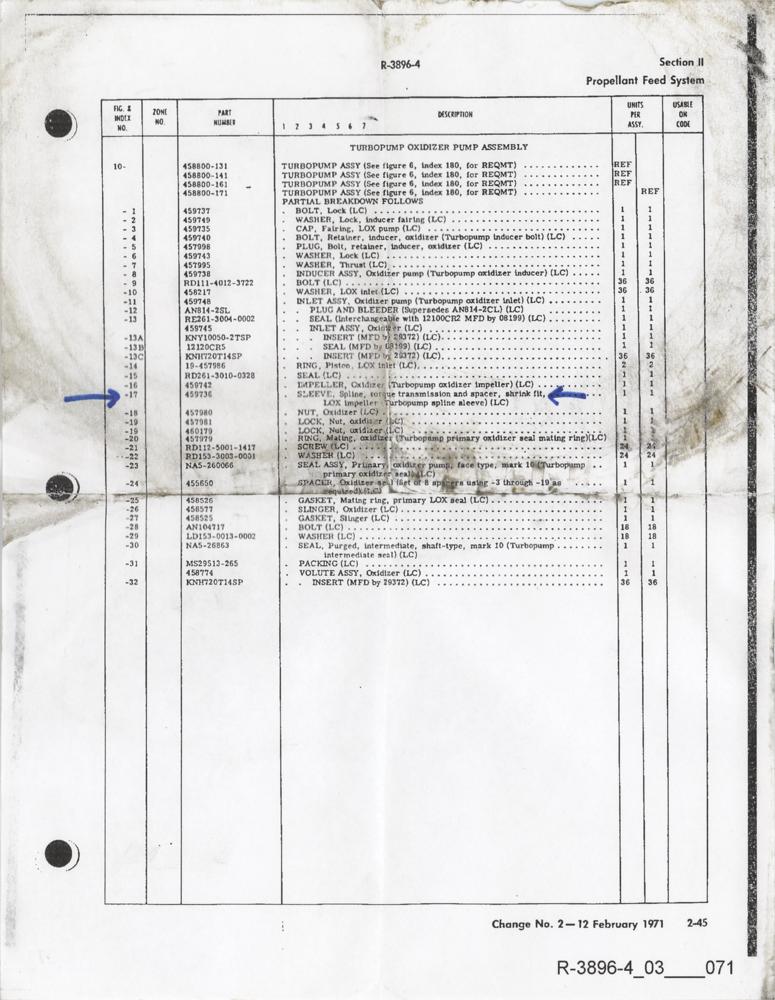 Apollo Saturn V F-1 rocket engine LOX impeller spline sleeve, measuring 4" tall and 6.75" in diameter, and weighing 16.3 pounds, etched on the rim with the part number: "459736," and manufacturer ID number, "02602 (40500)." Also bears several inspection stamps. In fine condition. Accompanied by a diagram of the F-1 engine's turbopump oxidizer assembly, part of the propellant feed system, showing the location of this piece of hardware.