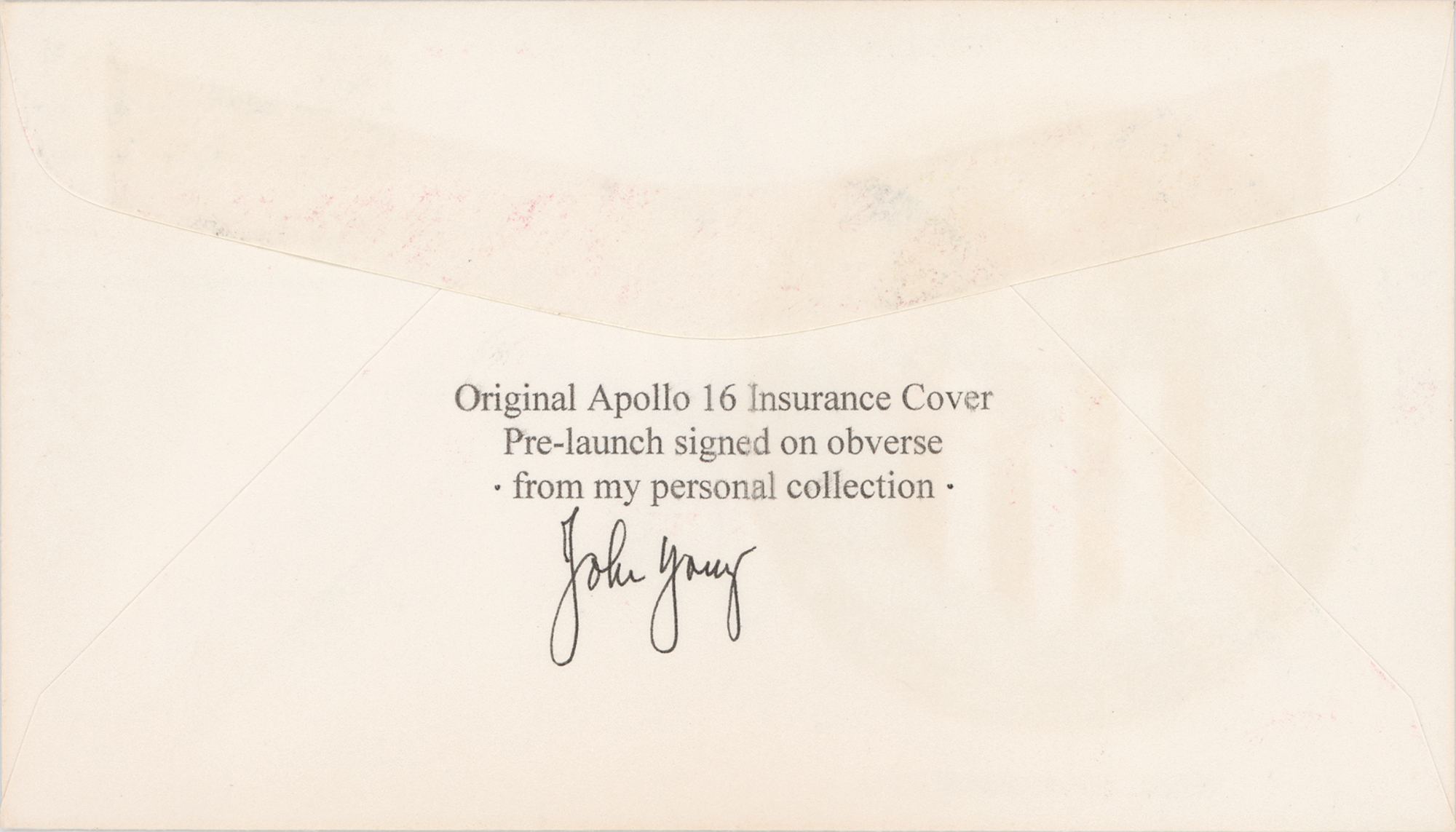 Desirable Apollo 16 insurance cover with a cachet of the mission insignia, bearing an April 16, 1972 launch date postmark at Houston, Texas, signed in black felt tip by John Young. Also stamped on the reverse, "Original Apollo 16 Insurance Cover, Pre-launch signed on obverse from my personal collection," signed below in black ink by Young. In very fine condition. These differ from the crew-signed insurance covers in that they were signed only by Young, carry the Stamp Club cachet (versus the Bishop cachet), and were canceled at Houston, rather than KSC.
