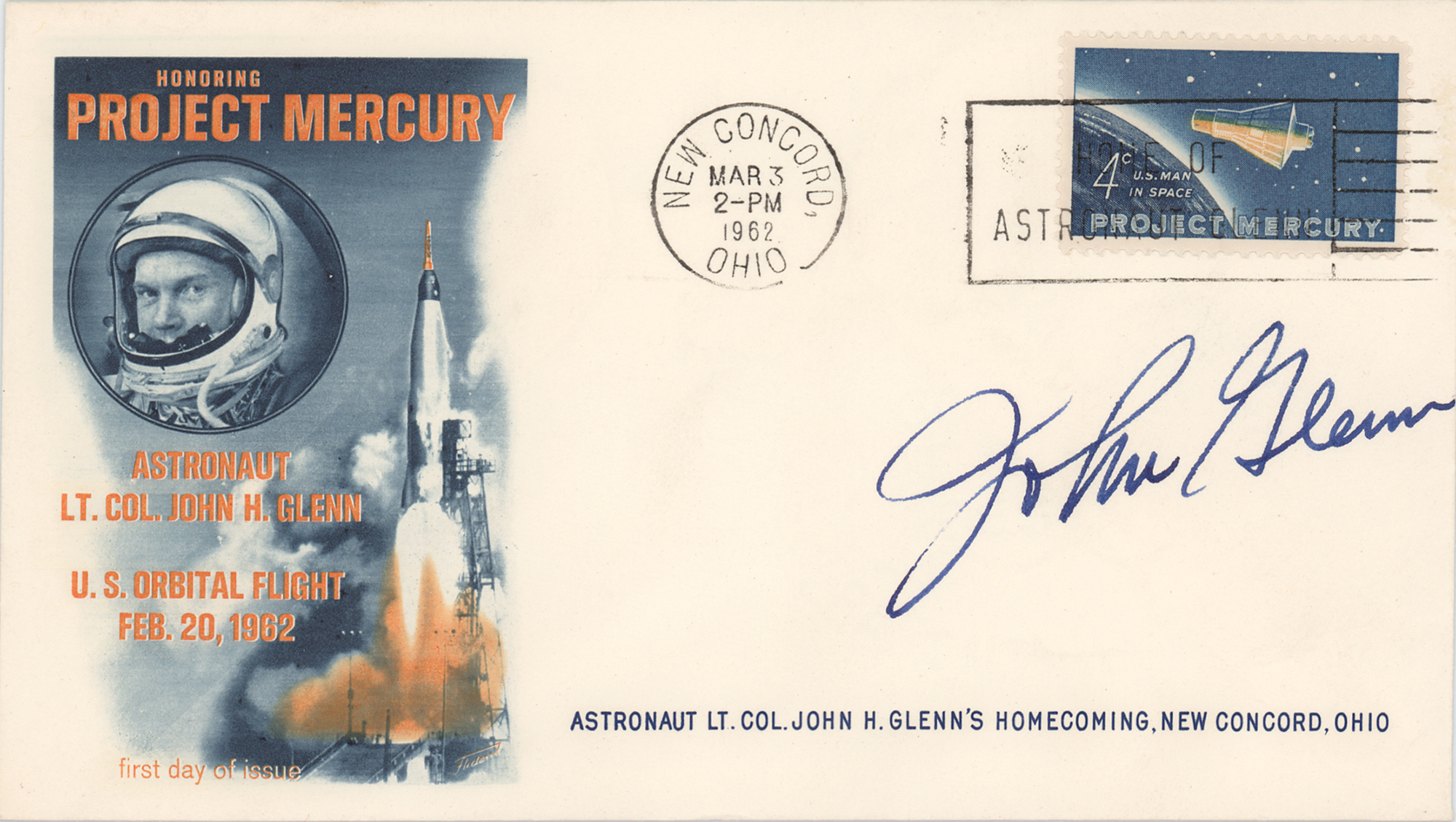 Commemorative cover with a colorful cachet honoring John Glenn's Mercury-Atlas 6 'Friendship 7' orbital flight, boldly signed in fountain pen, "John Glenn." In very fine condition.