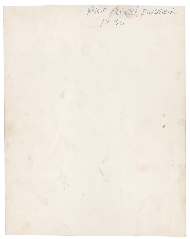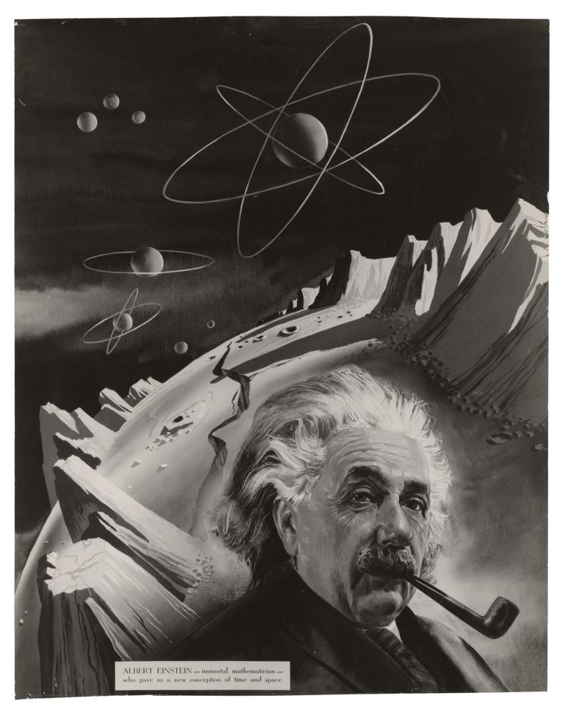 Unusual vintage glossy 8 x 10 silver gelatin photograph of a piece of artwork depicting the iconic visage of Einstein—stark white hair combed back, pipe in mouth—amidst the cosmos, with an intergalactic landscape behind him. Captioned along the bottom: "Albert Einstein—immortal mathematician—who gave us a new conception of time and space." Annotated on the reverse in ink in an unknown hand, "Prof. Albert Einstein, 1930." In fine condition, with scattered light creasing.
