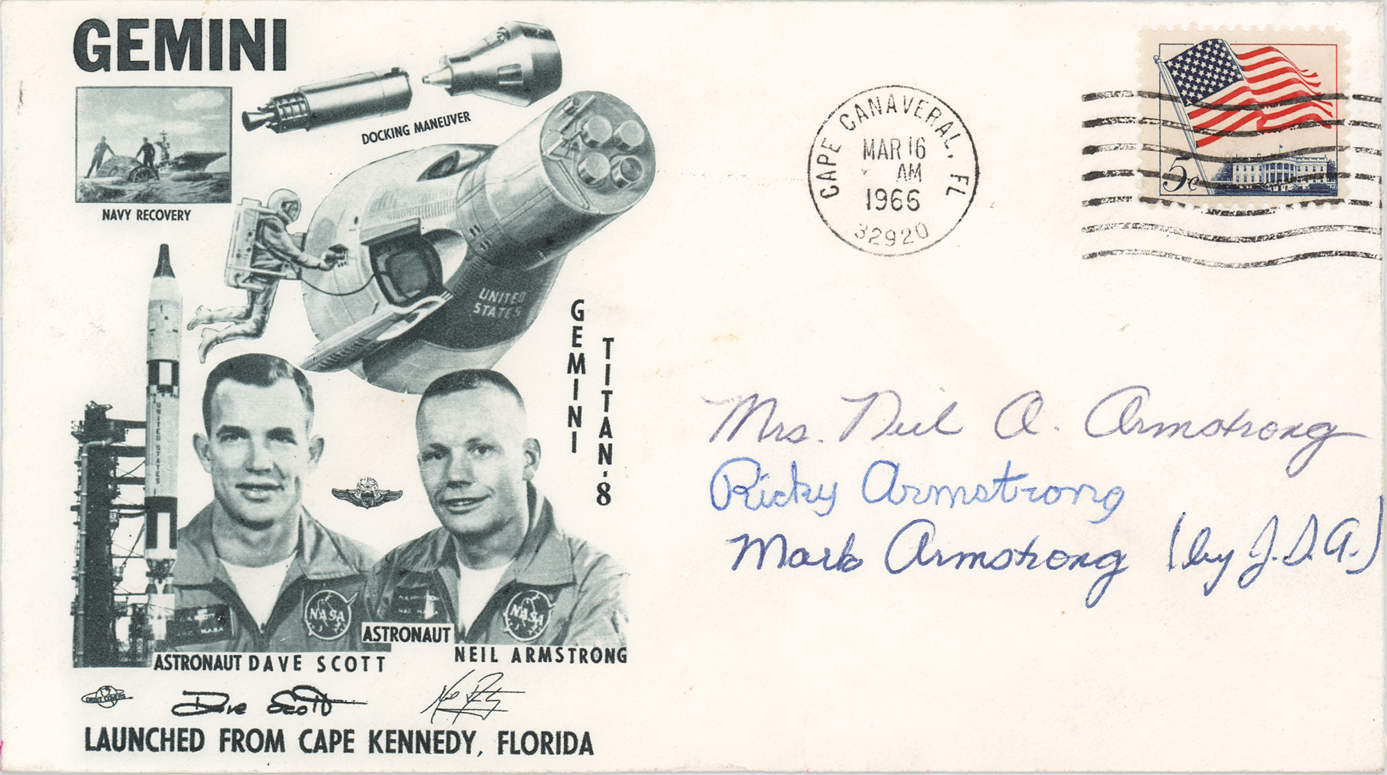 Commemorative cover with a cachet honoring the two-man crew of the Gemini 8 mission, postmarked at Cape Canaveral on March 16, 1966, the launch date of Gemini 8, signed in black ballpoint by Armstrong's first wife, Janet Shearon Armstrong ("Mrs. Neil A. Armstrong"), and by his eldest son Eric Armstrong ("Ricky Armstrong"). Janet has signed on behalf of their youngest son, Mark Armstrong, adding her initials to the right, "(by J.S.A.)." In fine condition.
