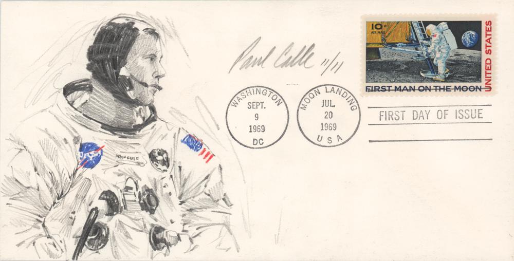 Limited edition FDC, 7.5 x 4, numbered 11/11, signed in pencil by artist Paul Calle, who has added a wonderful graphite and colored pencil sketch of Neil Armstrong wearing his white space suit. The cover is postmarked July 20, 1969, the date of the Apollo 11 moon landing, and September 9, 1969, the issue date for the jumbo-sized commemorative "First Man on the Moon" stamp, which is affixed to the right corner. In very fine condition.