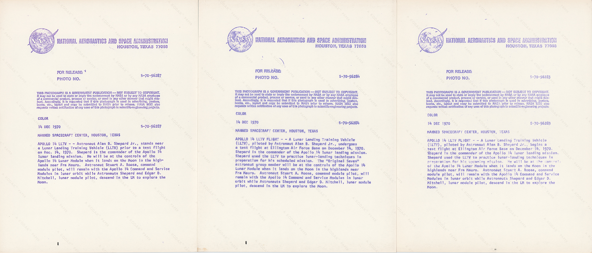 Lot of three original vintage color glossy 10 x 8 red-numbered NASA photos of Apollo 14 CDR Alan Shepard and the Lunar Landing Training Vehicle at Ellington Air Force base on December 14, 1970, with two (S-70-56283 and S-70-56284) showing Shepard piloting the LLTV, and one (S-70-56287) of him standing next to it prior to the test flight. Reverse of each photo bears “A Kodak Paper” watermarks and purple NASA caption text. In overall fine condition.