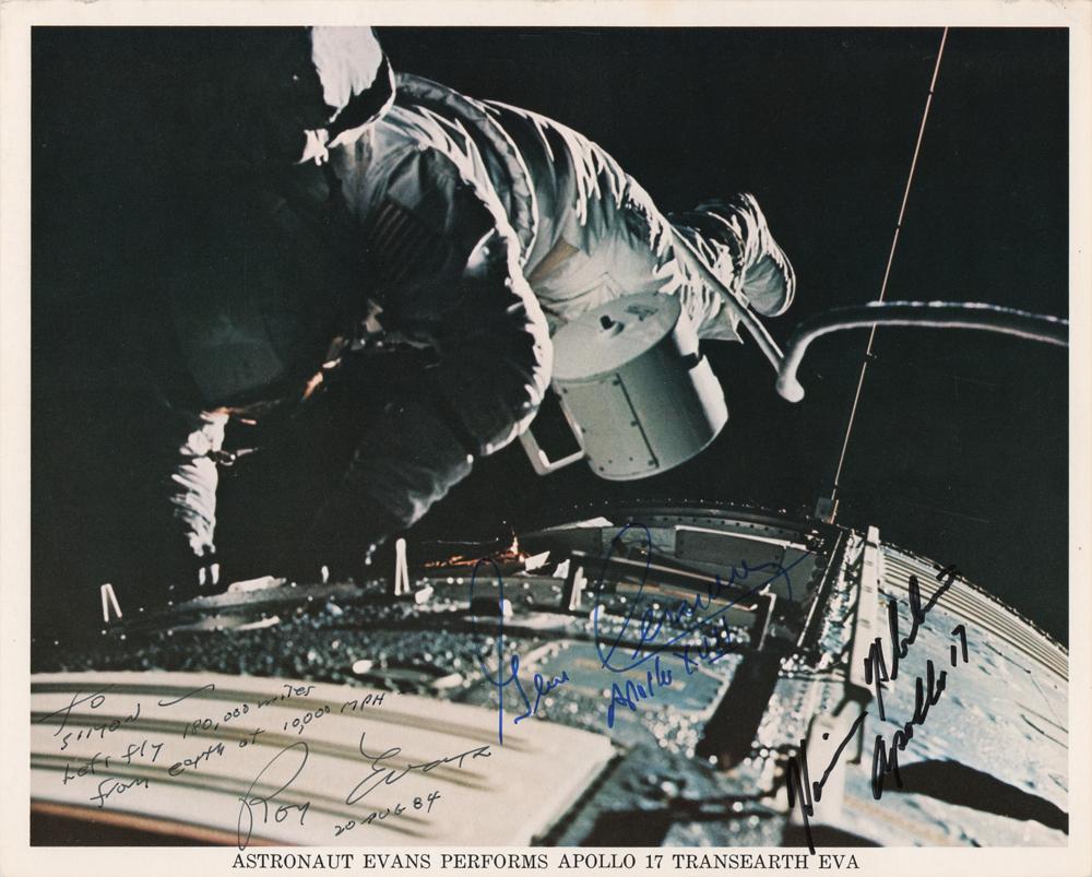 Official color 10 x 8 NASA lithograph of CMP Evans performing a Transearth EVA during the Apollo 17 mission, signed and inscribed in thin black felt tip, "To Simon, Let's fly 180,000 miles from Earth at 10,000 MPH, Ron Evans, 20 Aug 84," in blue felt tip, "Gene Cernan, Apollo XVII," and in black felt tip, "Harrison H. Schmitt, Apollo 17." In fine condition. Accompanied by a certificate of authenticity from Novaspace for the Cernan autograph.