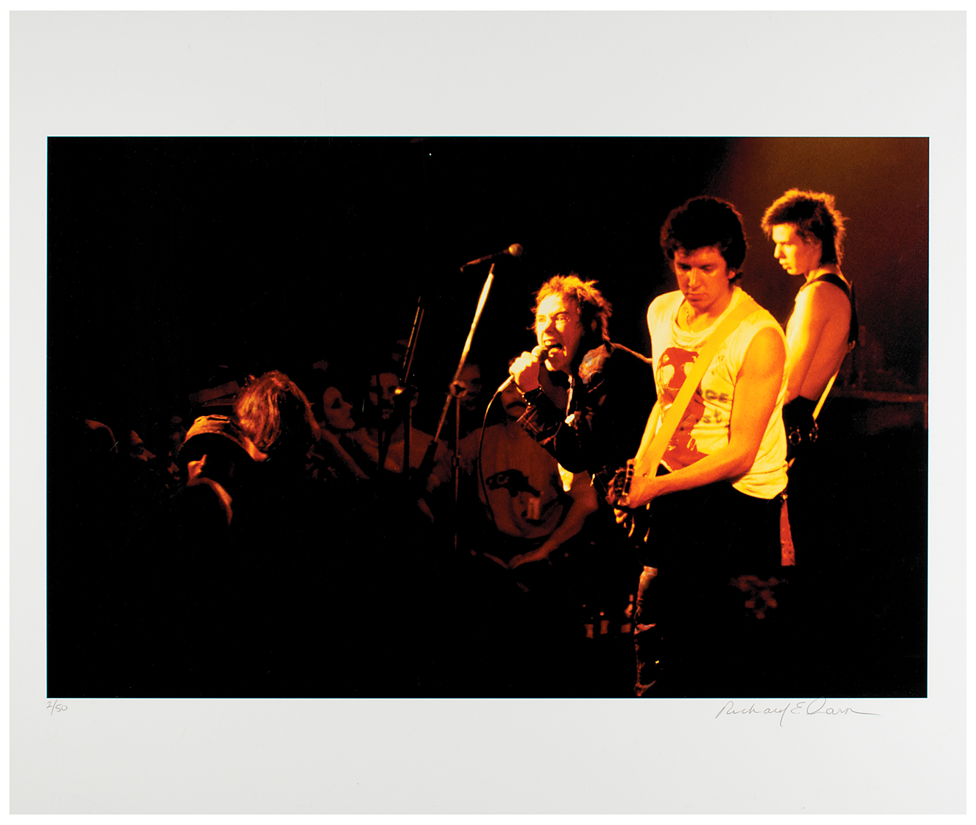 Color limited edition 24 x 20.5 print of the Sex Pistols on stage during a classic punk performance, numbered 2/50, signed in the lower border in pencil by rock photographer Richard E. Aaron. In very fine condition.