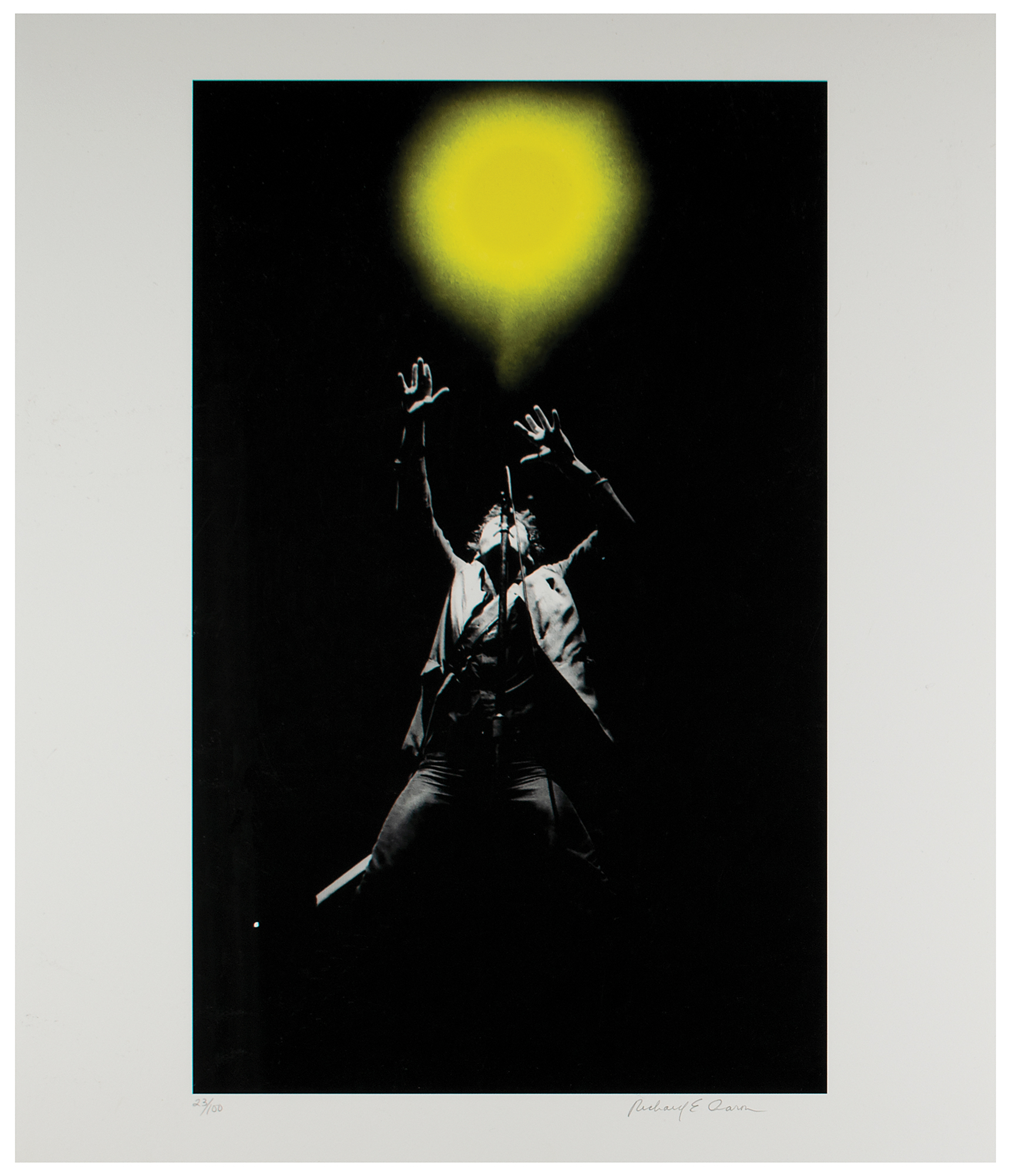 Dramatic limited edition 20.5 x 24 print of Bruce Springsteen in concert, numbered 7/100, signed in the lower border in pencil by rock photographer Richard E. Aaron. In very fine condition.