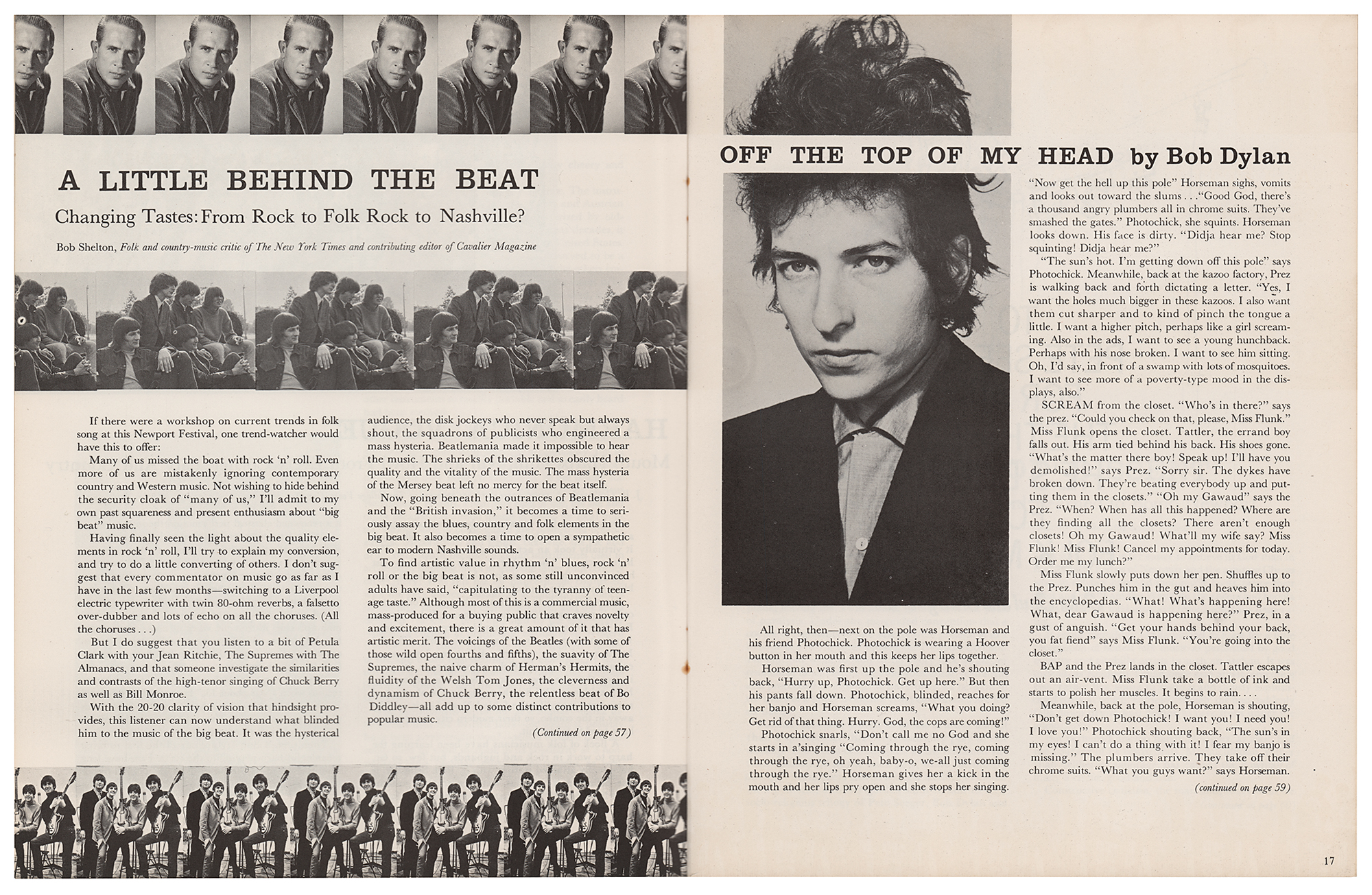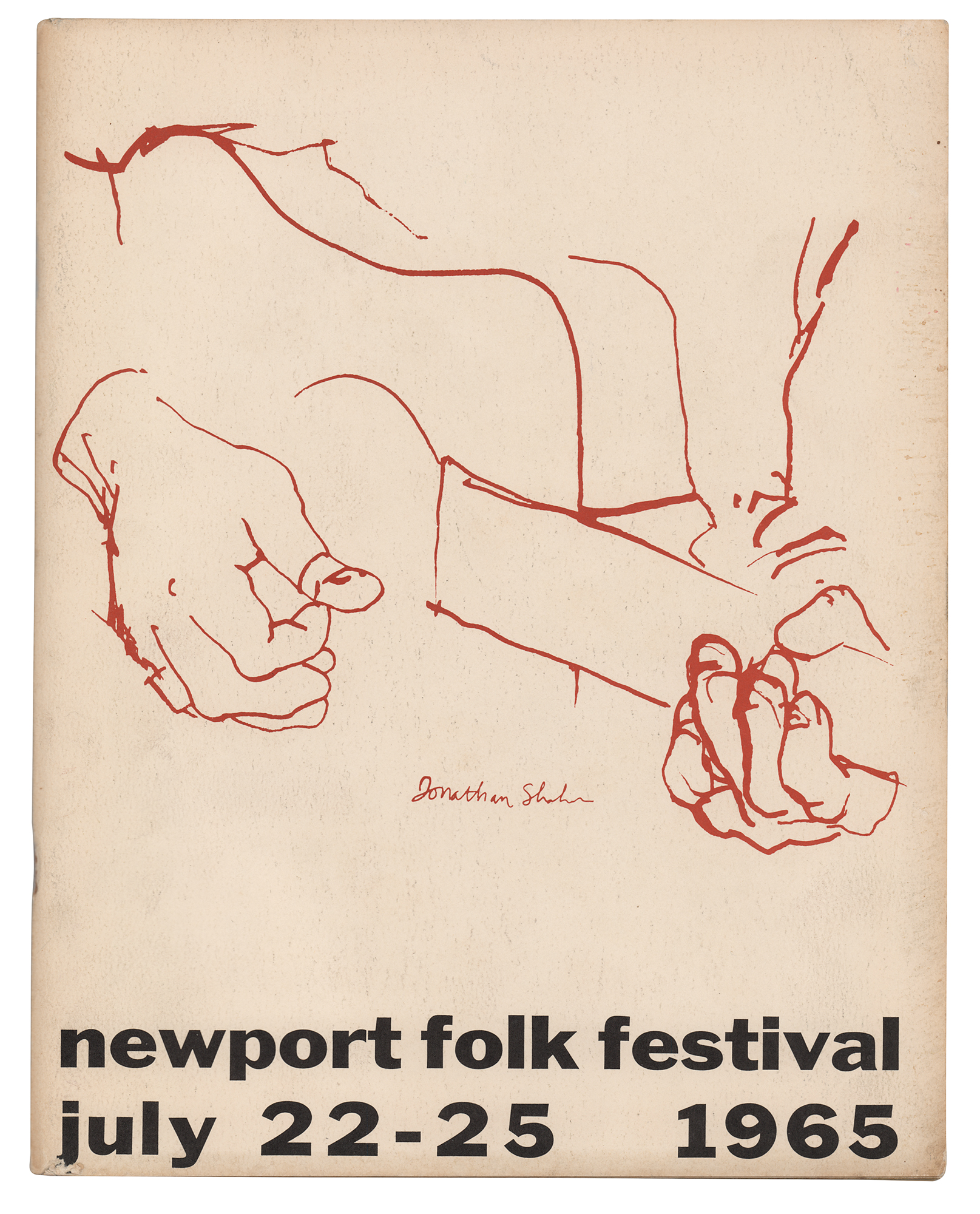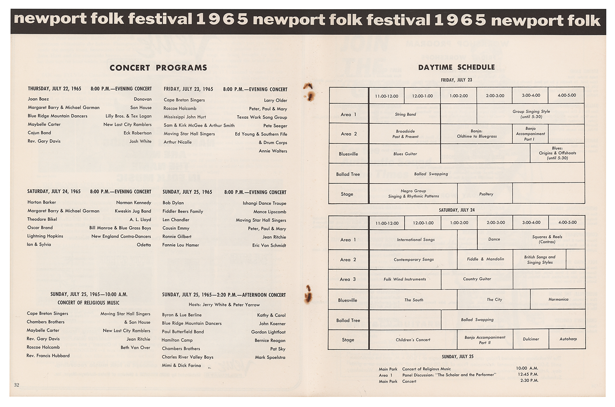 Program for the 1965 Newport Folk Festival, 8.5 x 11, 64 pages, made famous for Bob Dylan's iconic and controversial 'plugged in' set on July 25th, which included 'Maggie's Farm' and 'Like a Rolling Stone.' Received by the folk-loving audience with a mix of boos and cheers, Dylan was said to have 'electrified one half of his audience, and electrocuted the other.' This was a seminal moment in the history of modern music. Among the other performers at the festival were Joan Baez, Son House, Pete Seeger, Donovan, Lightnin' Hopkins, and the Paul Butterfield Band. In fine condition.
