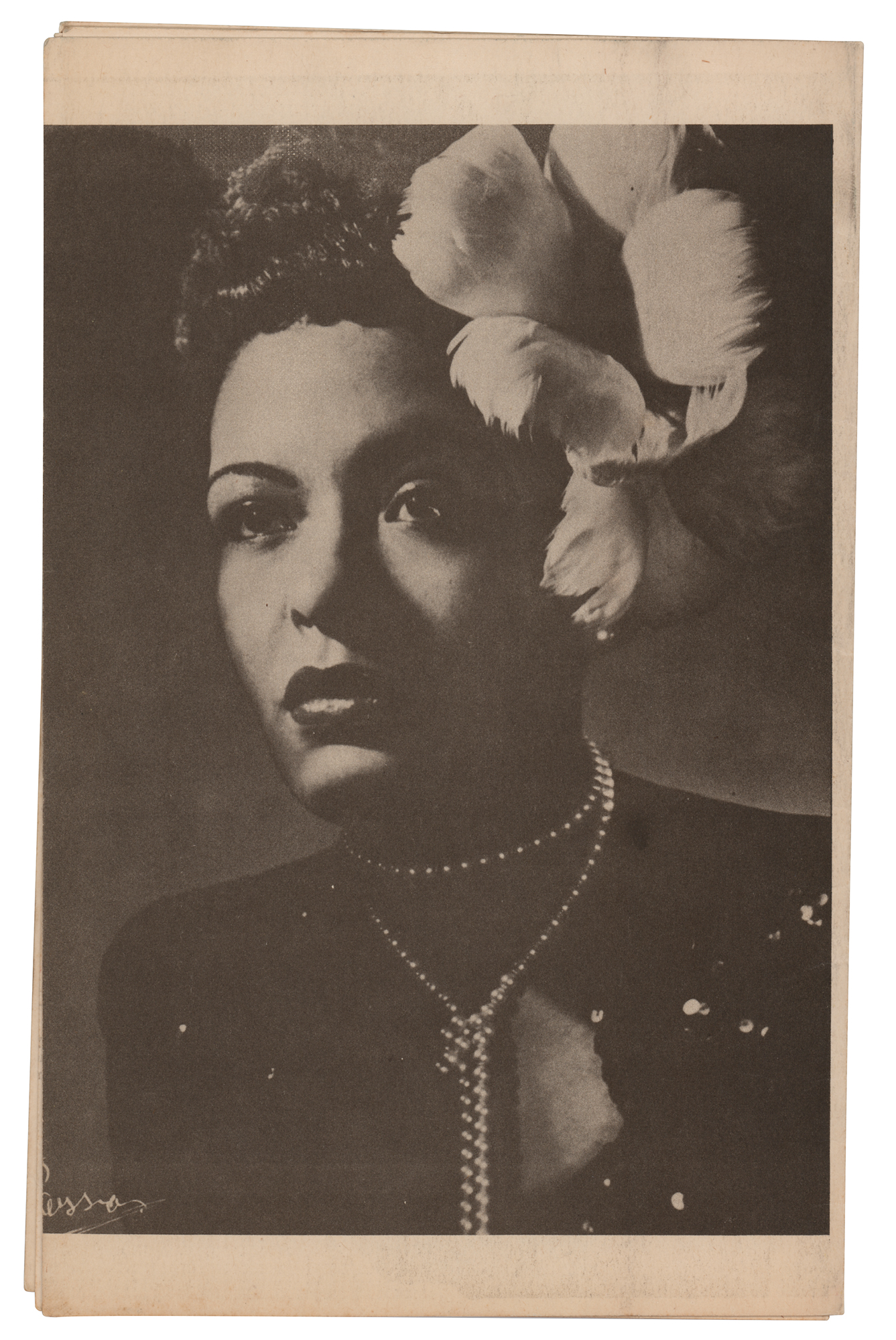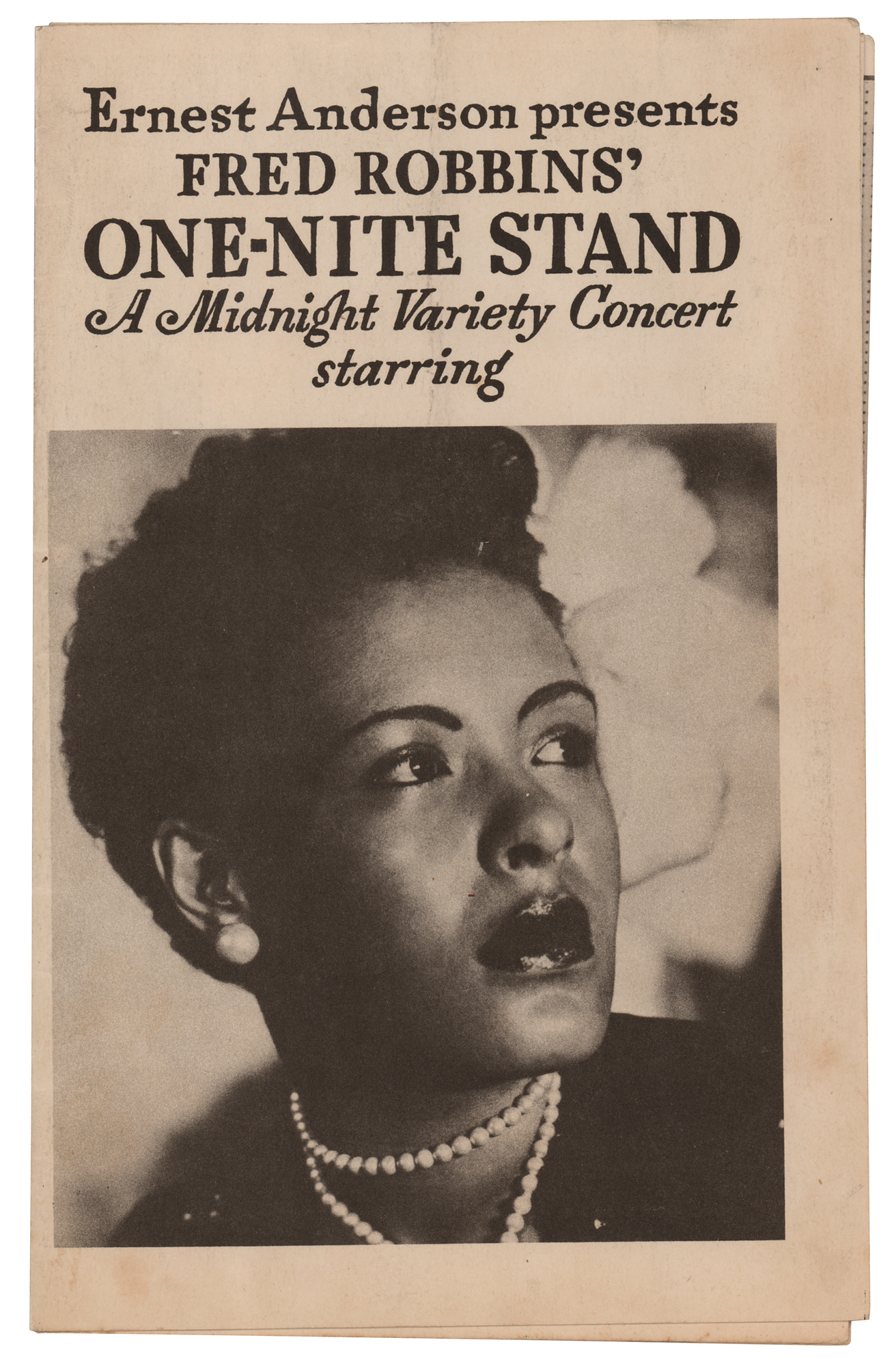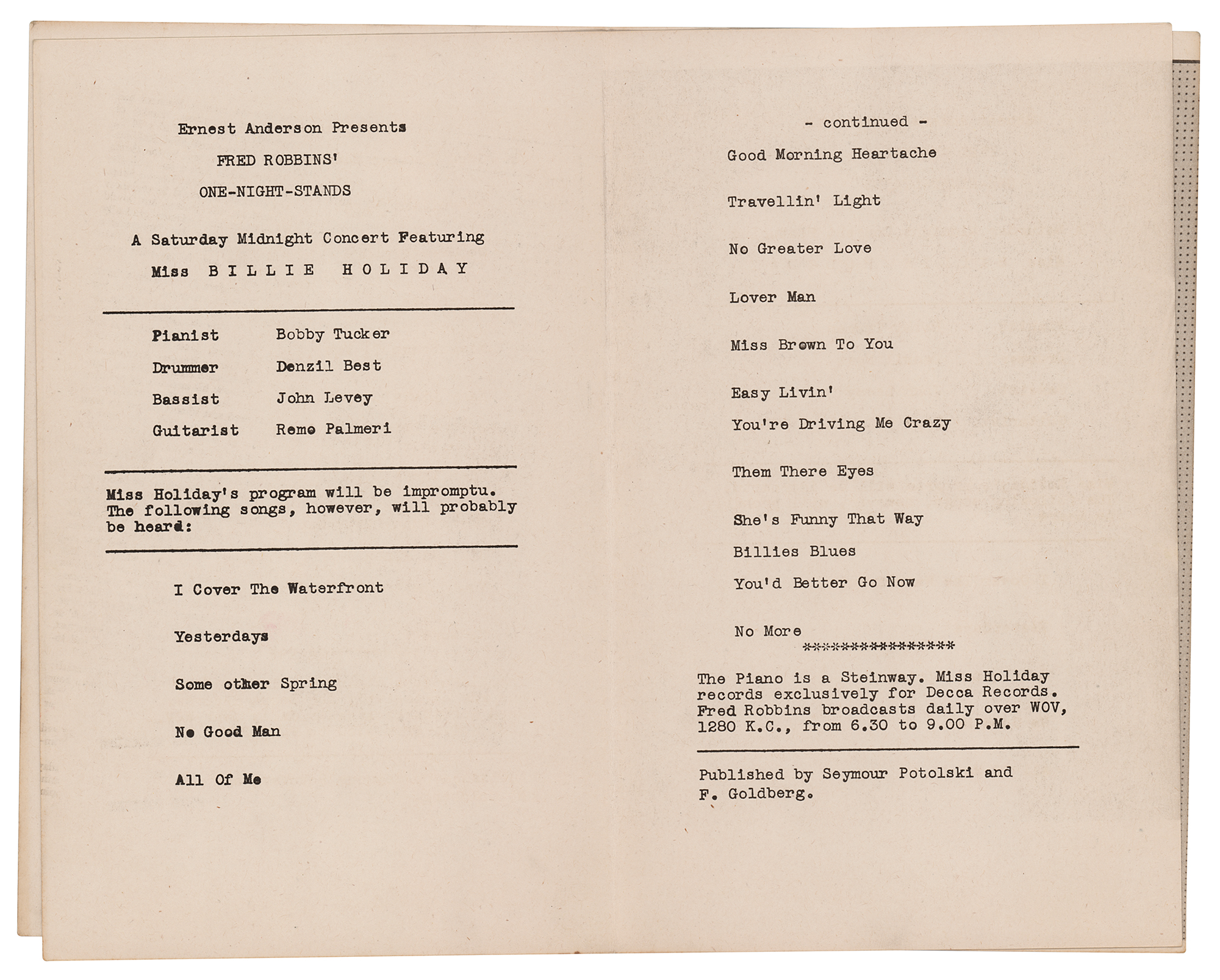 Original circa 1947-48 program for "Ernest Anderson presents Fred Robbins' One-Nite Stand," a midnight variety concert starring Billie Holiday with Bobby Tucker, Denzil Best, John Levey, and Remo Palmeri, 6 x 9.5, six pages, featuring three images of Holiday throughout. At the centerfold is a potential set list, with the disclaimer: "Miss Holiday's program will be impromptu. The following songs, however, will probably be heard." Among them are 'I Cover the Waterfront,' 'No Good Man,' 'Good Morning Heartache,' 'Lover Man,' and 'Them There Eyes.' In fine condition.