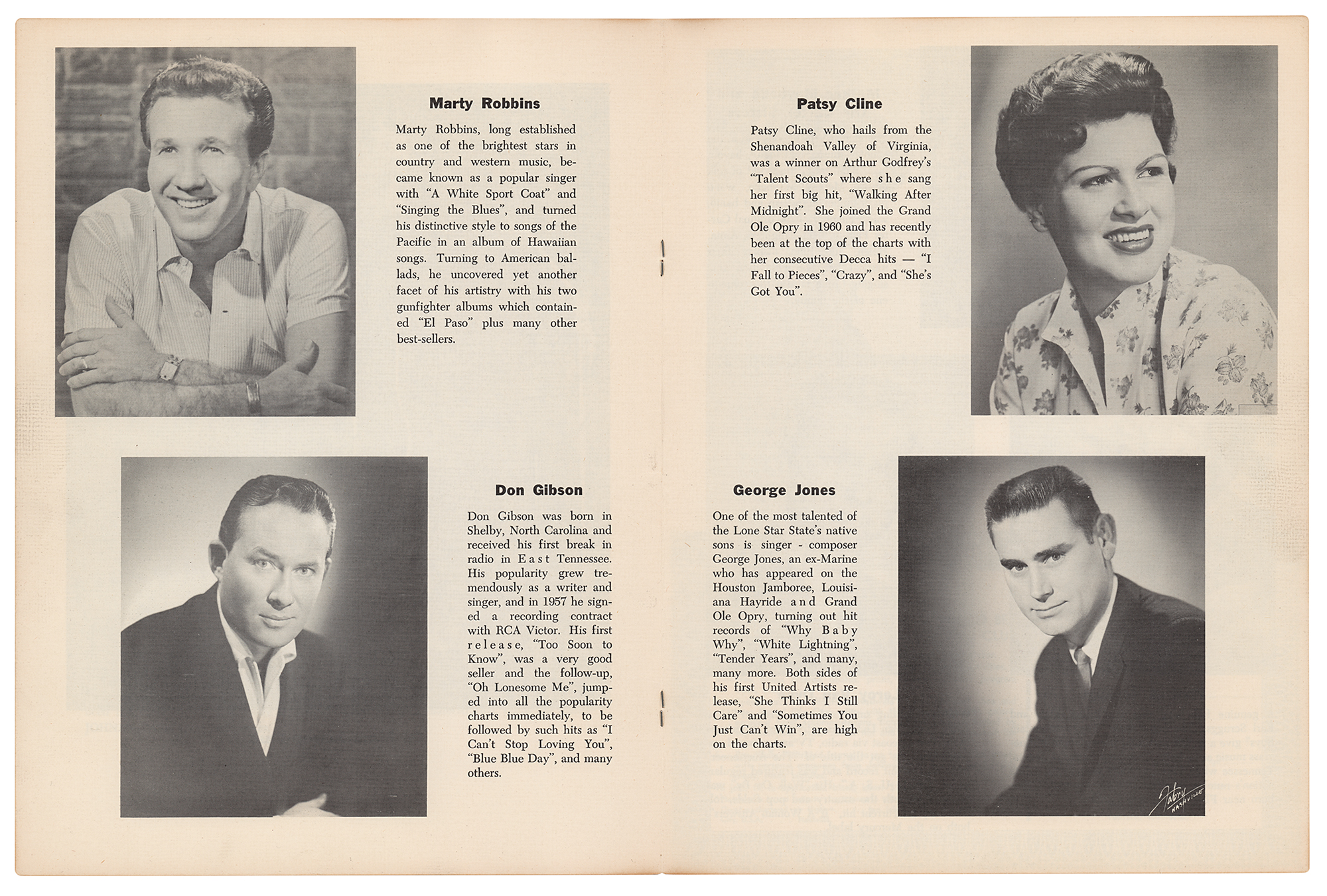 Original souvenir program for Johnny Cash at the Hollywood Bowl on June 15, 1962, 9 x 12, 14 pages, supported by a number of classic country acts including Patsy Cline, George Jones, Marty Robbins, Don Gibson, Lester Flatt and Earl Scruggs, Mother Maybelle and The Carter Sisters, and others. The front cover bills cash as "America's Foremost Singing Storyteller." In very good to fine condition, with moderate handling wear to the covers.