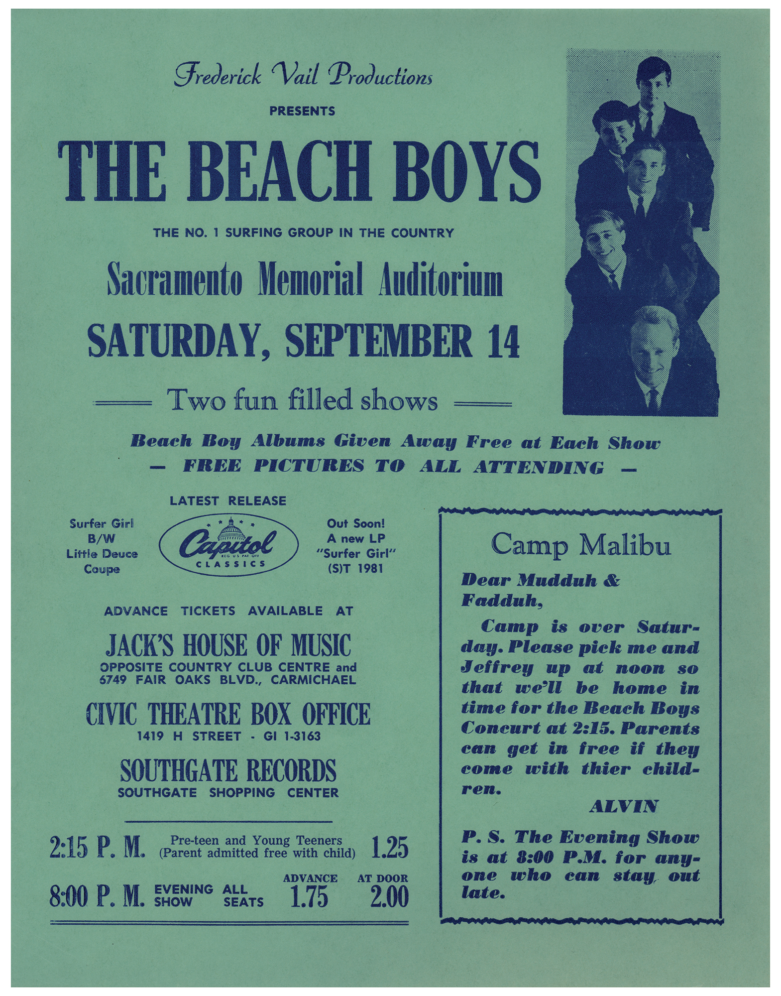 Original blue 8.5 x 11 handbill for the Beach Boys at Sacramento Memorial Auditorium on September 14, 1963, billing the band as "The No. 1 Surfing Group in the Country." In fine condition, with a crease to the lower left corner.