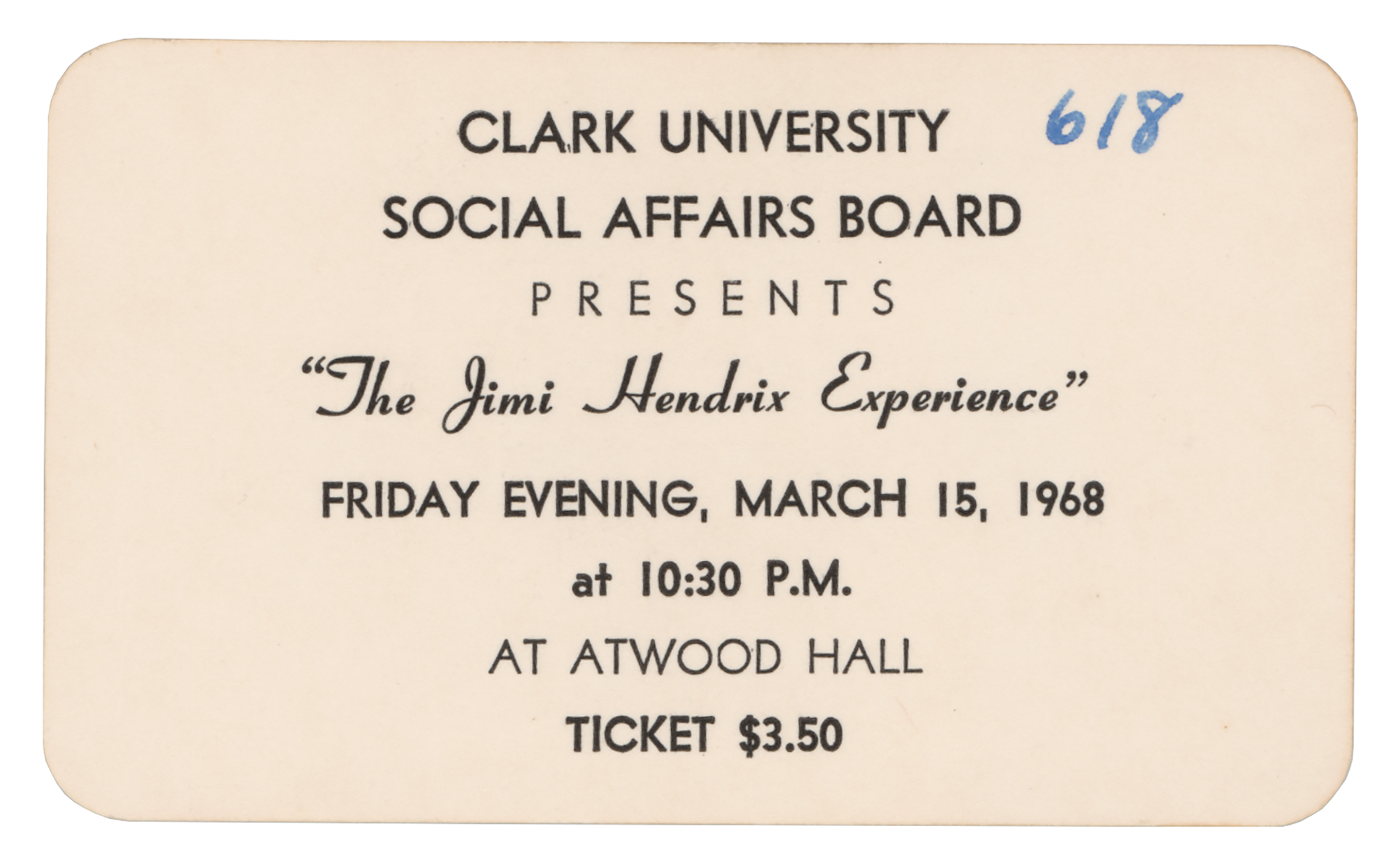 Uncommon original 3.75 x 2.25 admission pass for The Jimi Hendrix Experience at Clark University's Atwood Hall in Worcester, Massachusetts, on March 15, 1968. Annotated "618" in the upper corner. In fine condition. Played as part of his US tour in support of Axis: Bold as Love, this show came a year after Hendrix's memorable performance at the Monterey Pop Festival and a year before Woodstock. Among the classics he played that night were 'Foxey Lady' and 'Purple Haze.'