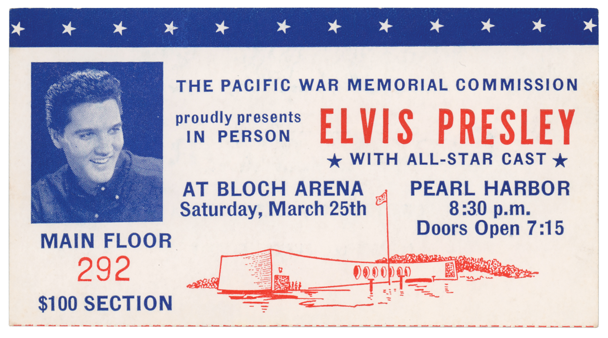 Highly desirable original 4 x 2.25 ticket for the benefit concert performed by Elvis Presley for the Pacific War Memorial Commission at Bloch Arena in the Pearl Harbor Navy Yard, Hawaii, on March 25, 1961, with a face value of $100. In fine condition.