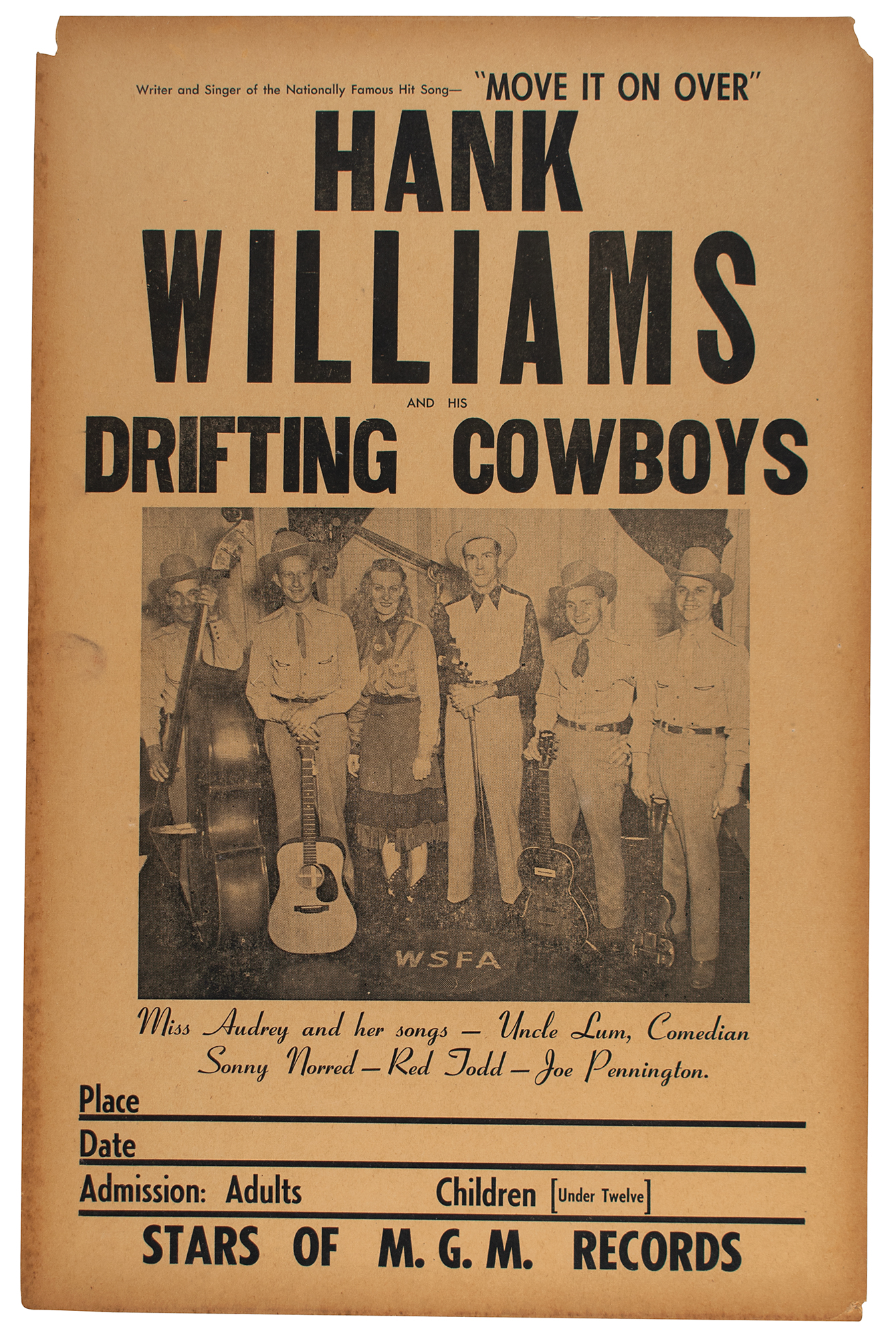 Rare original circa 1947 MGM Records boxing-style poster, 11 x 17, promoting a concert for Hank Williams and His Drifting Cowboys, with a group image below and text above reading: “Writer and Singer of the Nationally Famous Hit Song—‘Move It On Over.’” The poster also lists supporting acts like Miss Audrey, Uncle Lum, Sonny Norred, Red Todd, and Joe Pennington. The lower date and venue fields are blank. In very good to fine condition, with small chips and tears to the toned edges.