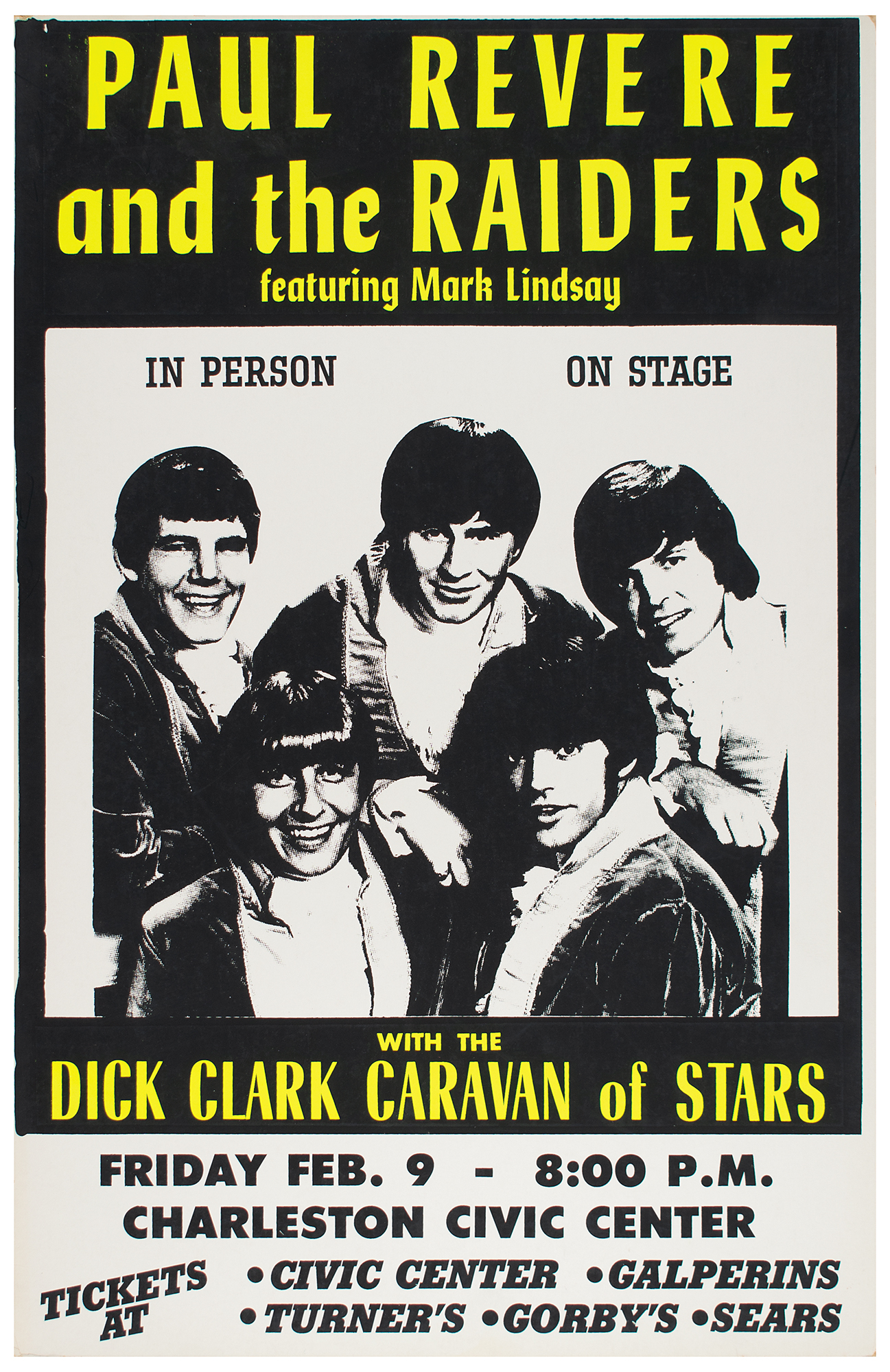 Original 14 x 22 silkscreen boxing-style poster for a Paul Revere and the Raiders (featuring Mark Lindsay) concert at the Charleston Civic Center in Charleston, West Virginia, on February 9, 1968. The poster features bright DayGlo yellow lettering and a large image of the band, with lower text listing the supporting act as the “Dick Clark Caravan of Stars.” Bottom section contains ticket and venue information. In fine condition, with some light marks and edgewear.