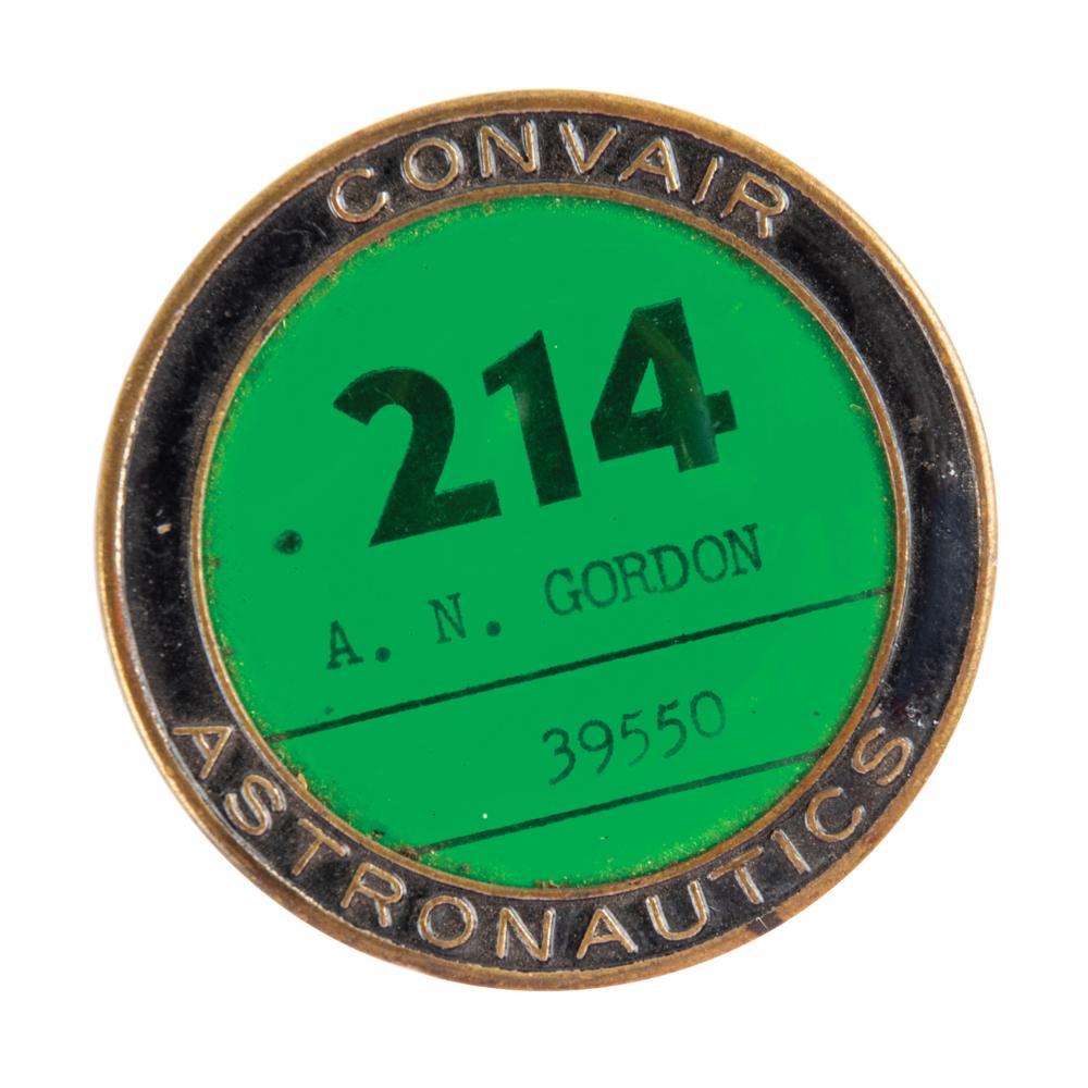Scarce vintage circa 1961 Convair Astronautics identification badge, 2″ in diameter, reading: "214, A. N. Gordon, 39550." Reverse bears a Whitehead & Hoag maker's mark. In fine condition. These rare badges were issued to employees of Convair's astronautics division based at Cape Canaveral. Convair manufactured the first Atlas rockets, including those used for the crewed orbital flights of Project Mercury.