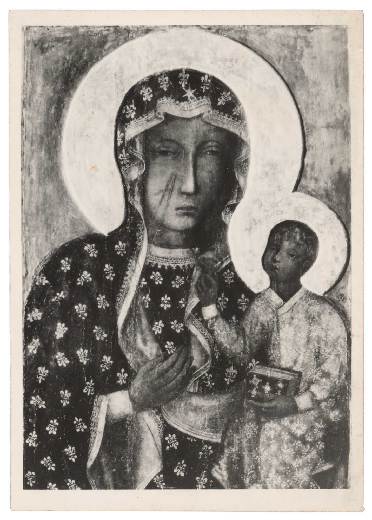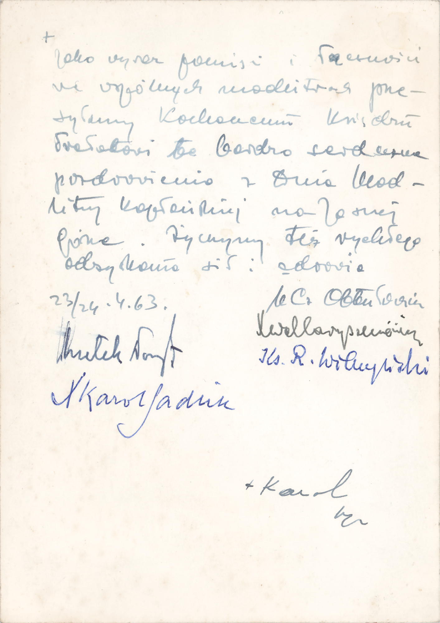 Vintage glossy 4 x 6 signed photograph of the Black Madonna of Czestochowa, Poland, signed on the reverse by a group of people including Karol Wojtyla ("Karol"), later Pope John Paul II, on April 23/24, 1963 when he was Auxiliary Bishop of Krakow, Poland, shortly after participating in the Second Vatican Council. In fine condition. A very scarce early signature of the future pope and Catholic saint.