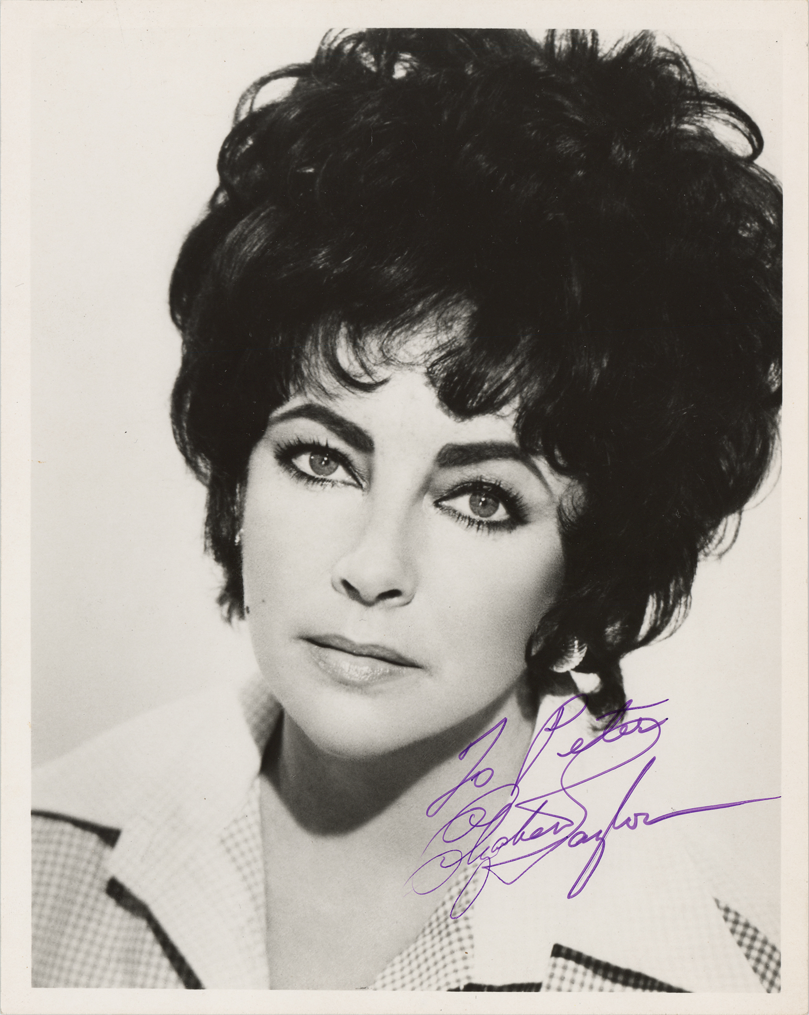 Glossy 8 x 10 close-up photo of the legendary Hollywood actress, signed and inscribed in purple ink, "To Peter, Elizabeth Taylor.” In fine condition, with scattered light creasing.