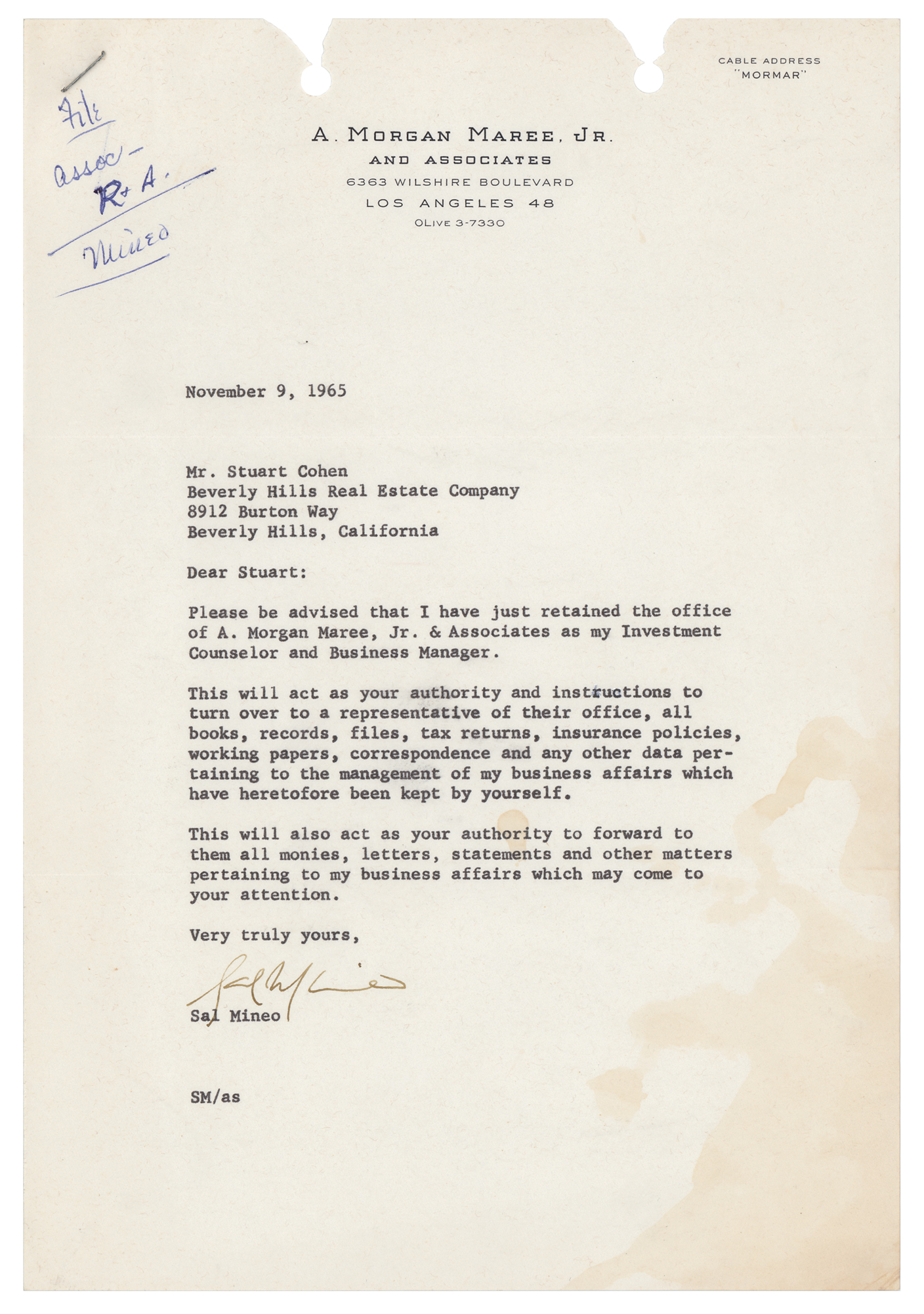 DS, one page, 7.25 x 10.5, A. Morgan Maree, Jr. letterhead, November 9, 1965. Official letter to his financial manager Stuart Cohen, advising him that he has retained a new Investment Counselor and Business Manager, and asking him to turn over all pertinent records and papers: "This will also act as your authority to forward them all monies, letters, statements and other matters pertaining to my business affairs which may come to your attention." Signed at the conclusion by Sal Mineo. In very good to fine condition, with two torn file holes to the top edge, and light creasing and staining to the lower right blank area.