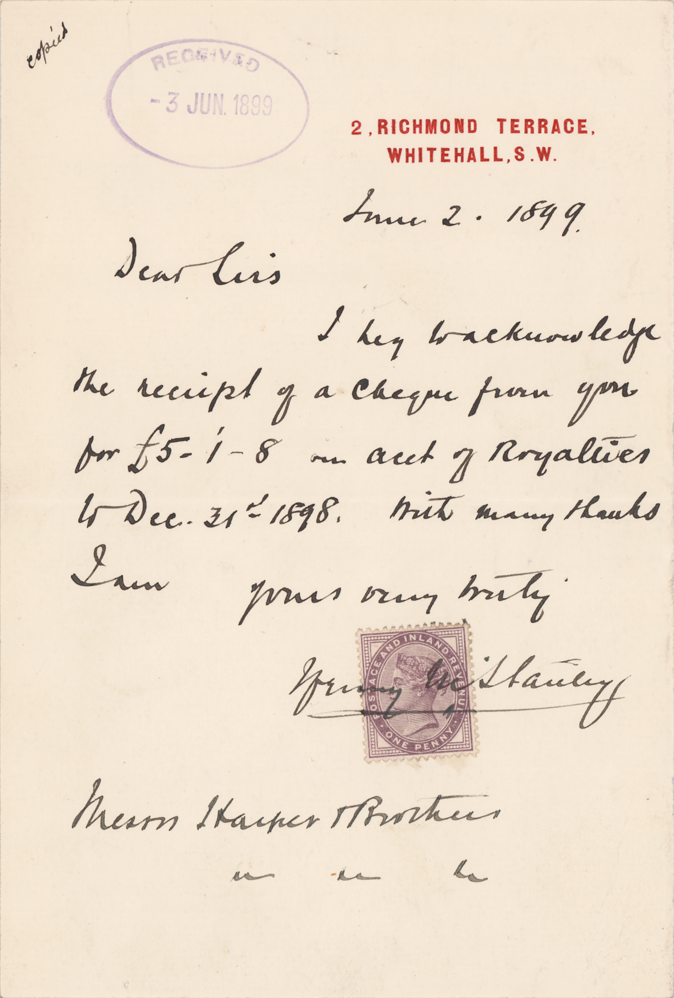ALS signed “Henry M. Stanley,” one page, 4.75 x 7.25, Richmond Terrace letterhead, June 2, 1899. Handwritten letter to Harper & Brothers, in full: "I beg to acknowledge the receipt of a cheque from you for £5.1.8 on acct. of Royalties to Dec. 31st 1898." In fine condition. Harper & Brothers published several of Stanley's works in America, including Through the Dark Continent, The Congo and the Founding of Its Free State, and Slavery and the Slave Trade in Africa.