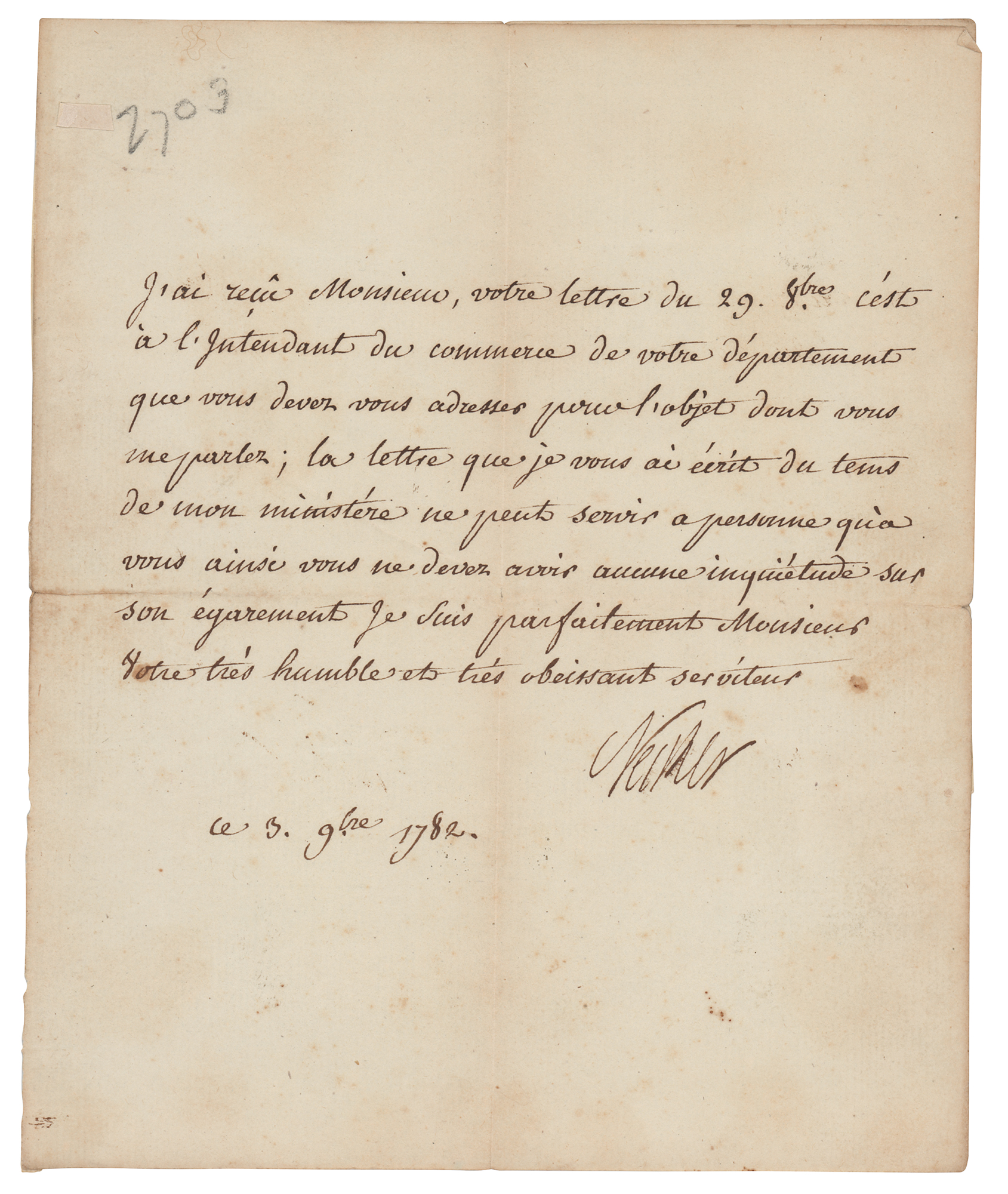 French statesman of Swiss birth (1732-1804) and finance minister of Louis XVI, a post he held in the lead-up to the French Revolution in 1789. Untranslated LS in French, signed “Necket,” one page, 6.25 x 7.75, November 3, 1782. In fine condition, with scattered faint toning.