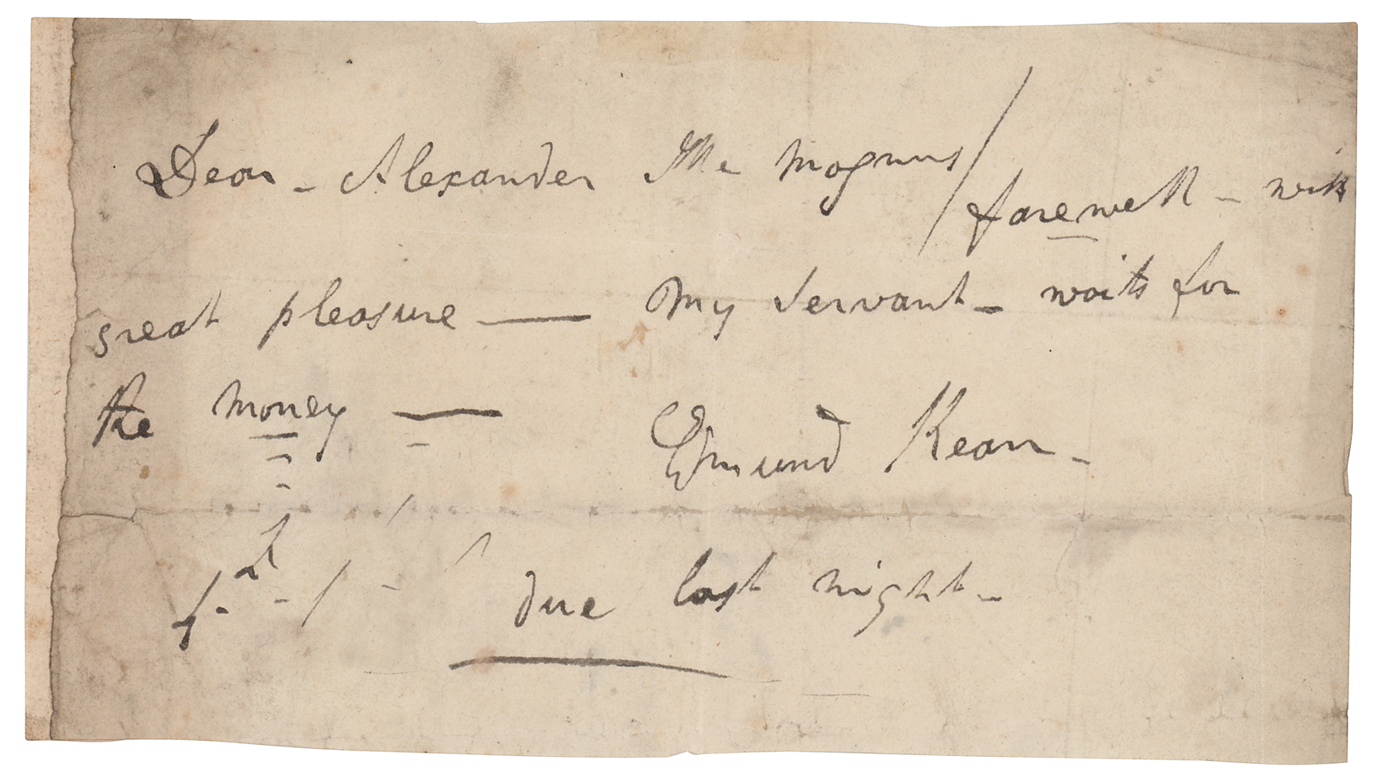 English actor (1787-1833) regarded as the greatest Shakespearean actor of his day. ALS, one page, 7.25 x 4.25, no date. Handwritten letter to Alexander Magnus, in full: "Farewell—with great pleasure—my servant waits for the money." He adds emphasis in a postscript: "Due last night." In very good to fine condition, with scattered soiling and toning.