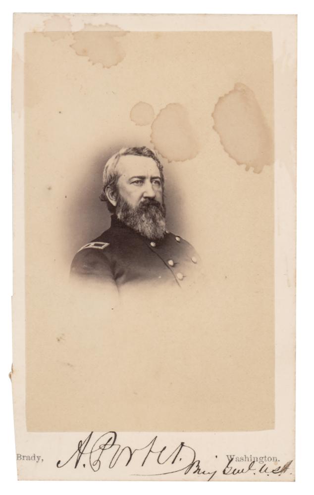 Brigadier general (1829-1872) in the Union Army during the Civil War, who served as Provost Marshal of the Army of the Potomac under George B. McClellan during the 1862 Peninsula Campaign. Uncommon 2.5 x 4 carte-de-visite photo of Porter in uniform by Mathew Brady, signed on the mount in ink, "A. Porter, Brig. Genl. U.S.A." In very good to fine condition, with a trimmed left edge, and staining to the image.
