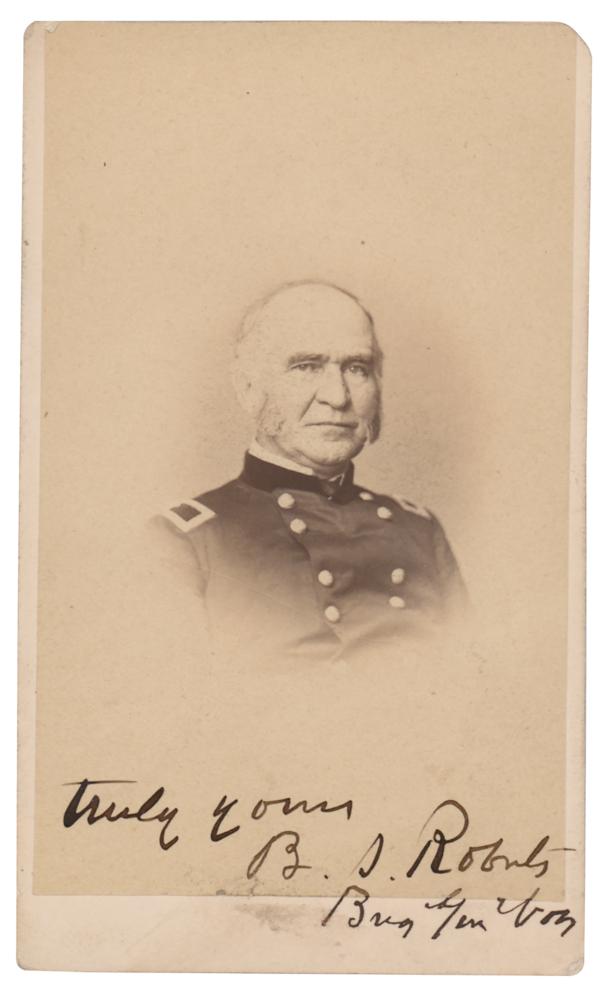 American lawyer, civil engineer, and Union Army general during the Civil War (1810-1875), who saw action at Cedar Mountain, Rappahannock Station, Sulphur Springs, and the Second Battle of Bull Run. Scarce 2.5 x 4 carte-de-visite photo of Roberts in uniform by Henry Ulke of Washington, signed in ink, "Truly yours, B. S. Roberts, Brig. Gen'l Vols." In fine condition.