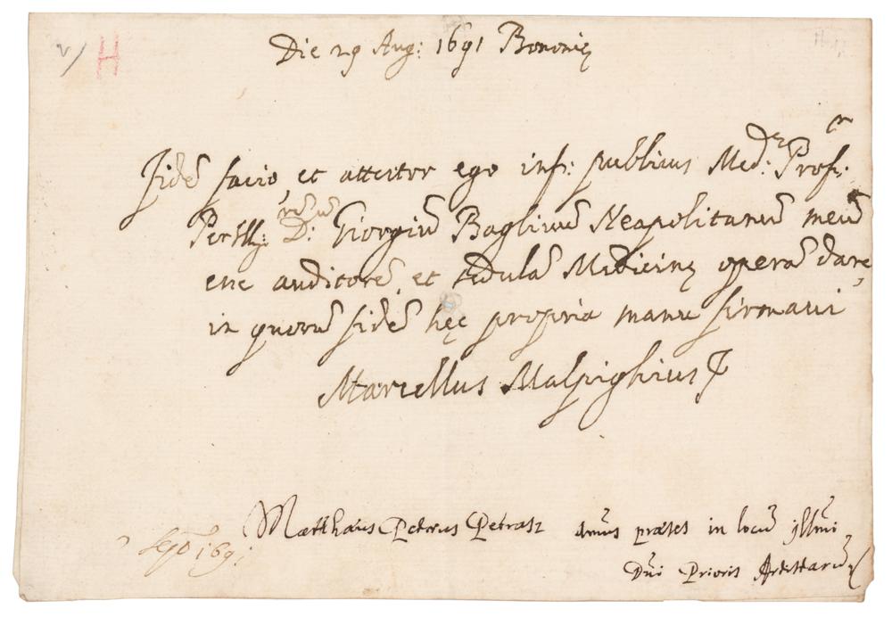 Italian doctor (1628-1694) who gave his name to several physiological features and played an important part in the discovery of the microscope and study of human physiology. ALS in Latin, signed “Marcellus Malpighius,” one page, 7.75 x 5.25, August 29, 1691. Handwritten letter, in part (translated): "I, Professor of Medicine?award to Giorgio Baglioni of Naples, this Medical Certificate of completion, and in good faith and with my own hand place my signature thereto." In fine condition, with two small holes affecting nothing.