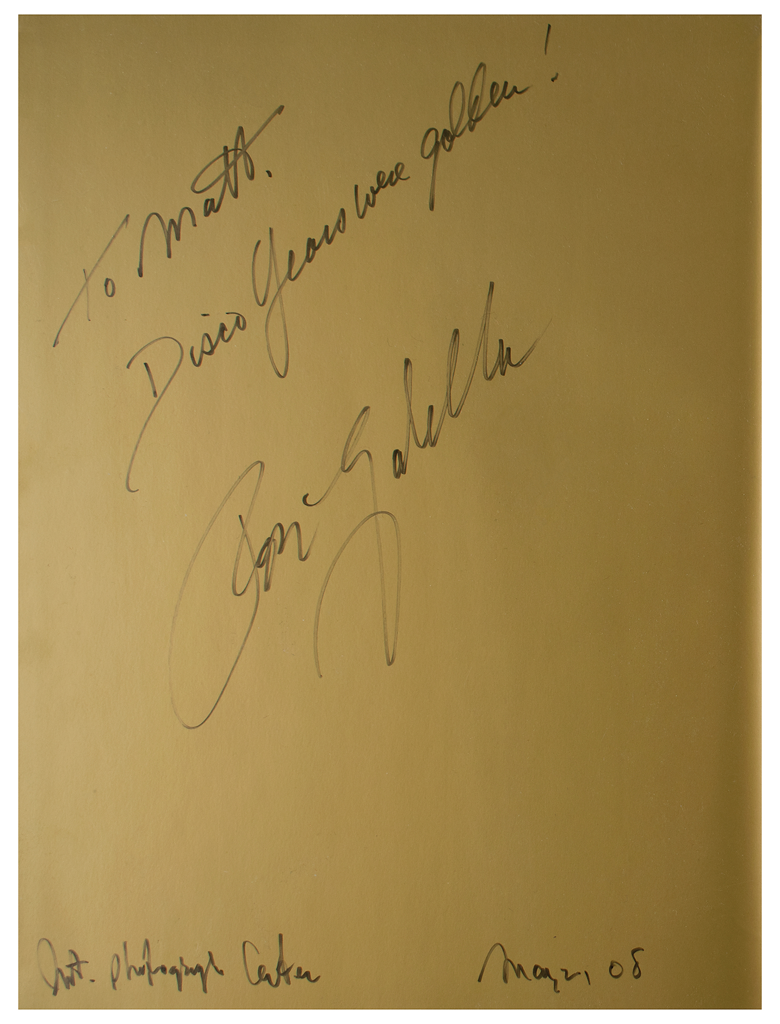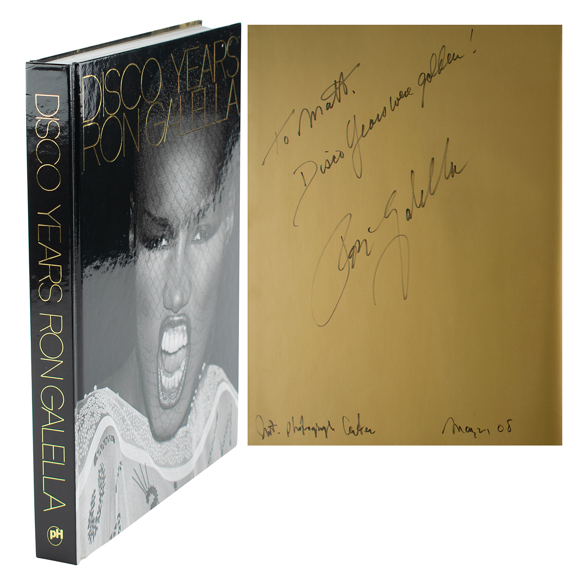 Signed book: Disco Years: Ron Galella. First edition. NY: Powerhouse Books, 2006. Hardcover, 9.75 x 12.25. Signed and inscribed opposite the title page in black felt tip, "To Matt, Disco Years were golden! Ron Galella, Int. Photograph Center, May 2, 08." In fine condition. Includes the original International Center of Photography bag. An attractive oversized edition featuring a veritable who's who of the disco era, which contains images taken at such venues as Studio 54, The Four Seasons, El Morocco, The Hollywood Palladium, and more.