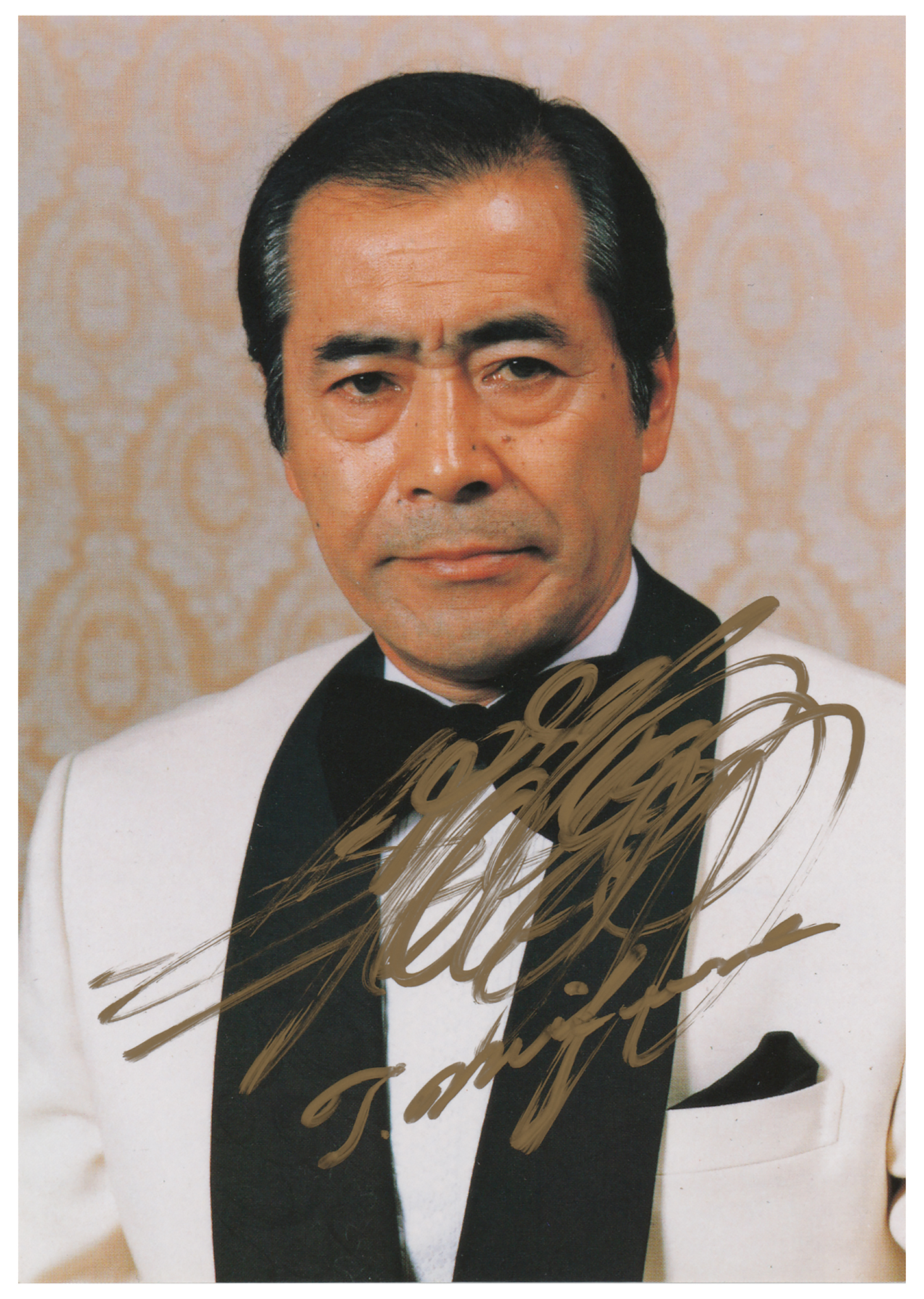 Color glossy 4.25 x 6 Mifune Productions postcard with an image of the actor in a white tuxedo, signed in gold ink in English and Japanese. In fine condition. A handsome portrait of the great Toshiro Mifune, arguably the most famous actor in Japanese cinema history.