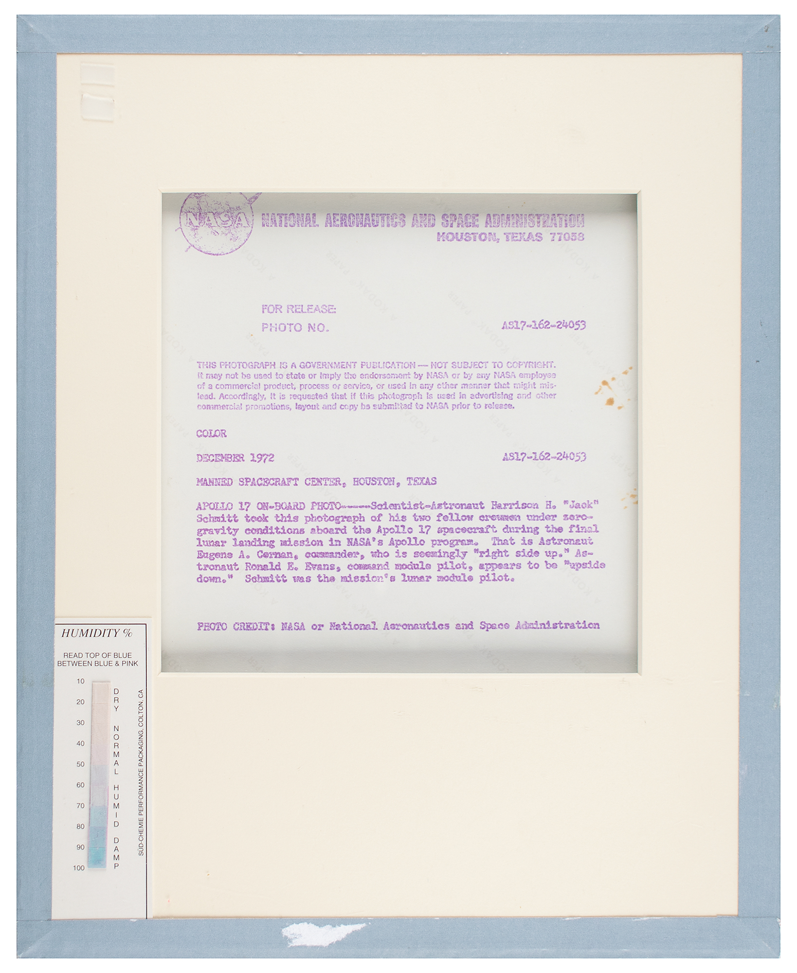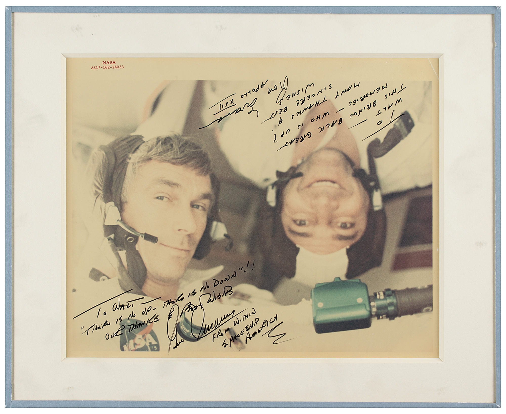 Fantastic official color glossy 10 x 8 red-numbered NASA photo of Cernan and Evans inside the Apollo 17 spacecraft, signed and inscribed in black felt tip, "To Walt—'There is no up—there is no down!' Our thanks and best wishes, Gene Cernan, From Within Spaceship America" and "To Walt—This brings back great memories—who is up? Many thanks & sincere best wishes, Ron Evans, Apollo XVII.” Reverse bears purple NASA caption text and “A Kodak Paper” watermarks. Matted to an overall size of 13 x 10.5. In fine condition, with a small crease to an upper corner.