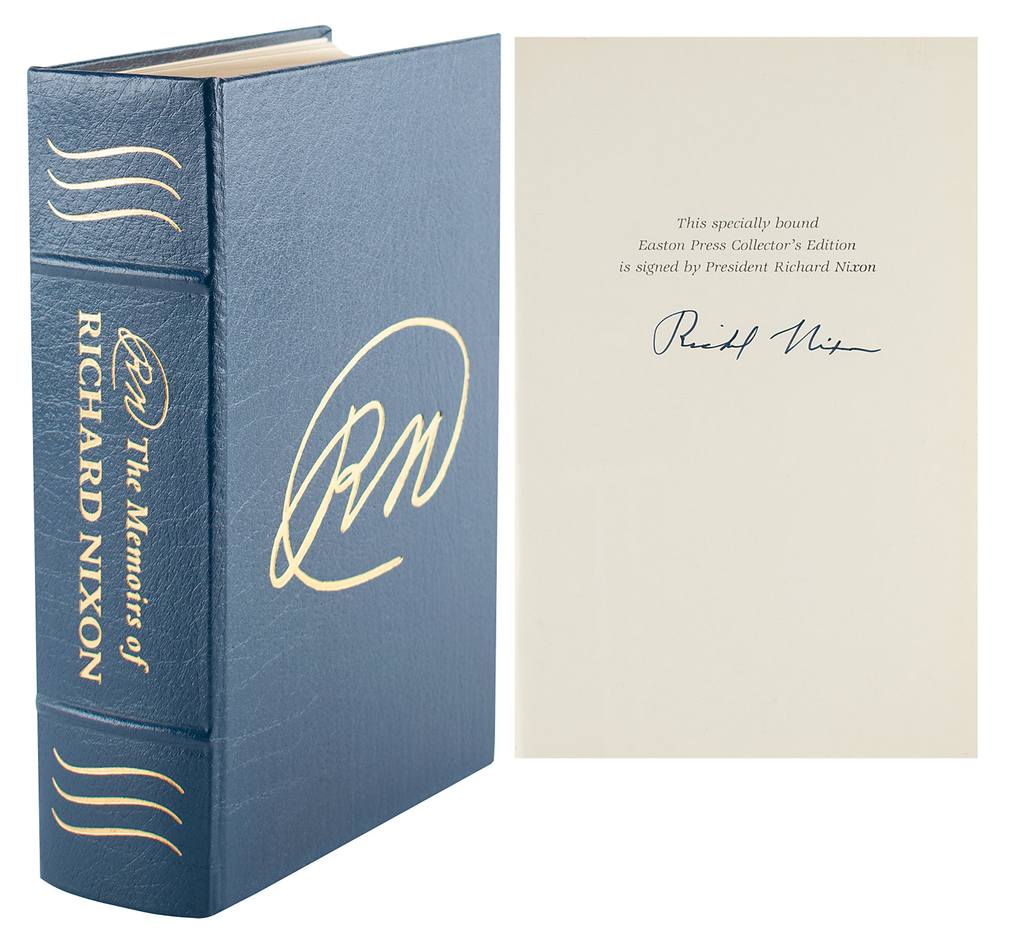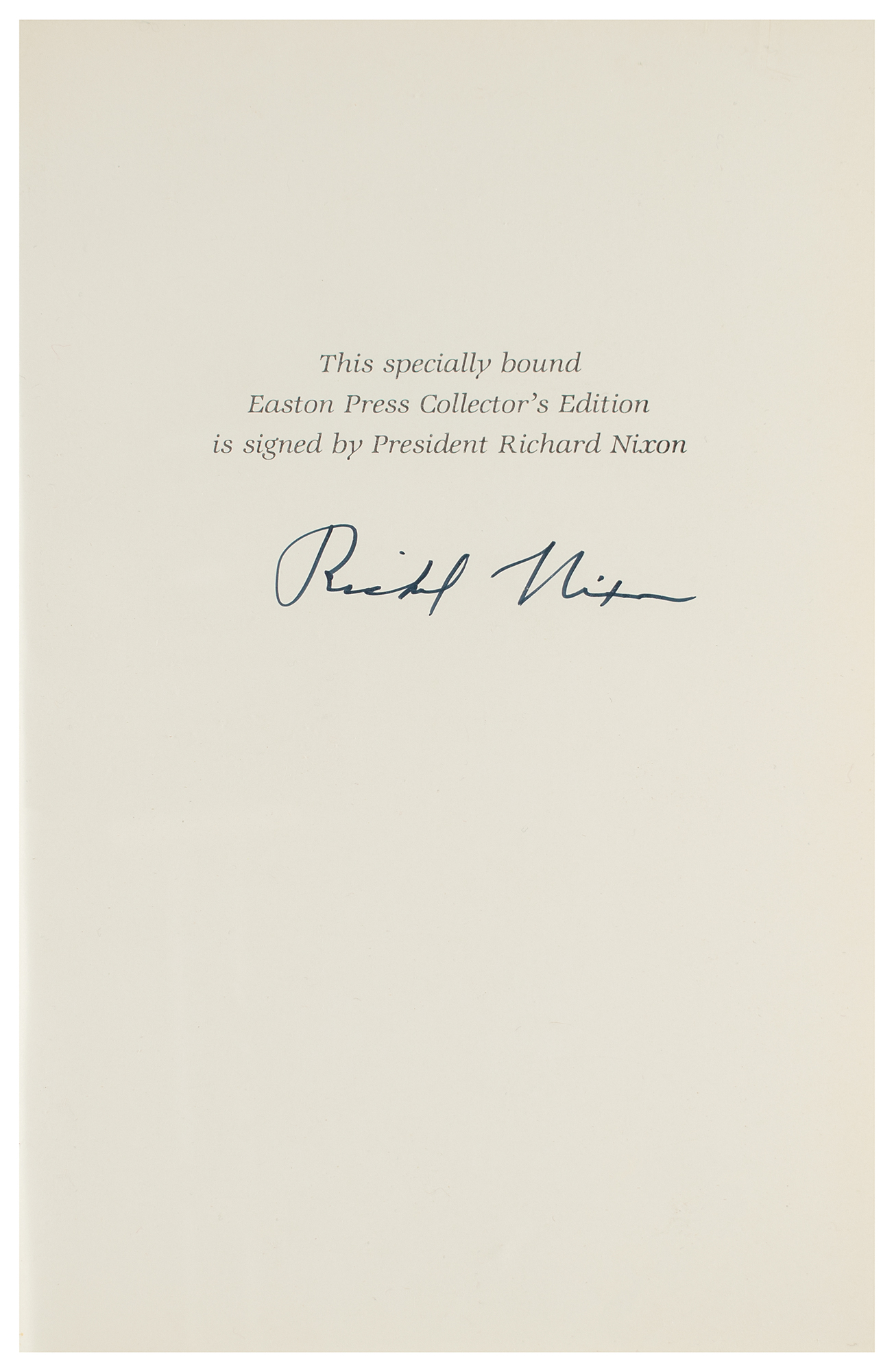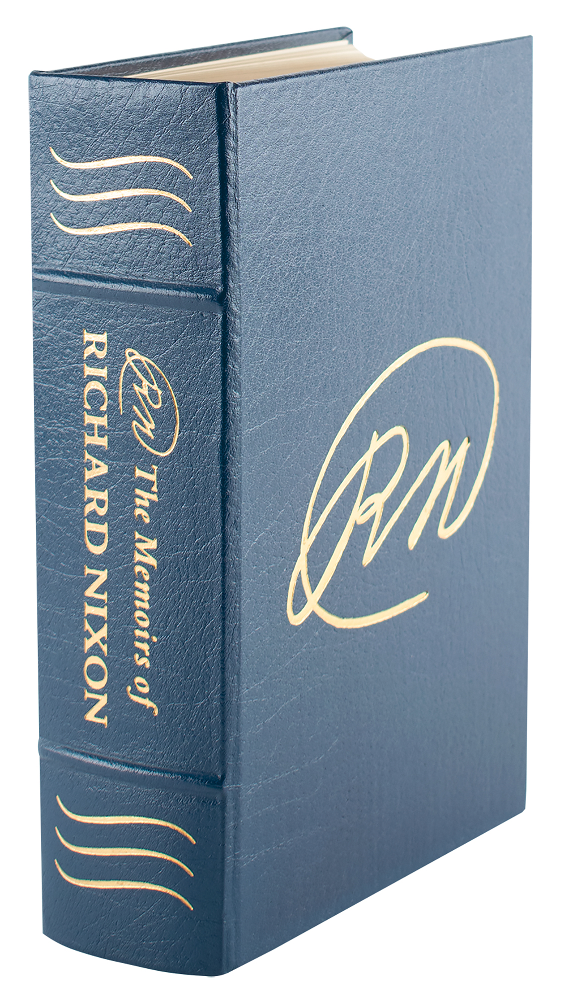 Signed book: RN: The Memoirs of Richard Nixon. Collector's edition. Norwalk, CT: Easton Press, 1988. Leather-bound hardcover, 6.5 x 9.5, 1118 pages. Signed in black ink on a specially printed prefatory page by Richard Nixon. In fine condition, with prior owner's bookplate to front pastedown.