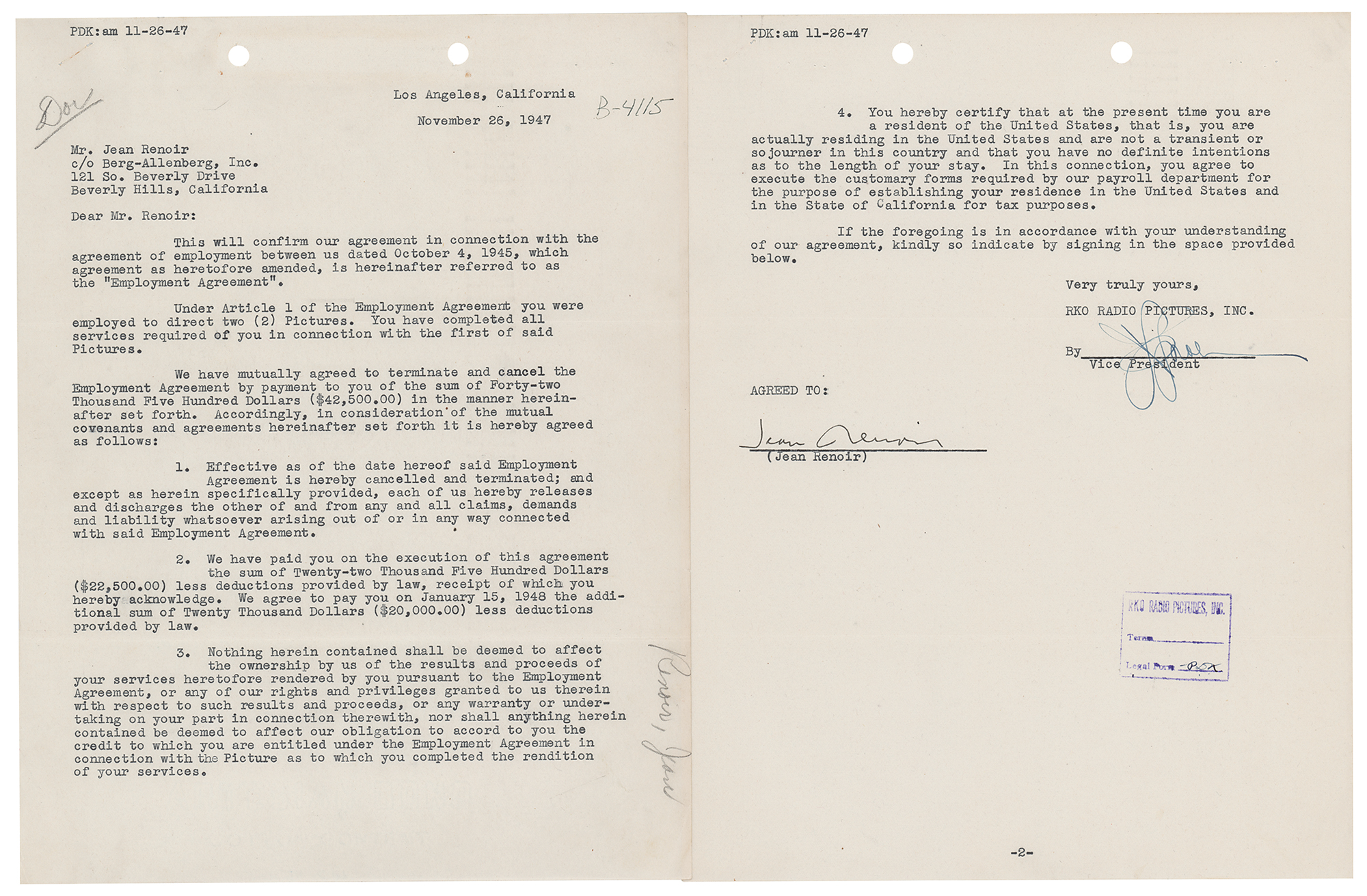 Distinguished French director (1894-1979) whose 1939 classic Rules of the Game takes a place among the most acclaimed films ever made. DS, two pages, 8.5 x 11, November 26, 1947. Renoir confirms the termination of an employment agreement with RKO Radio Pictures, Inc. Signed at the conclusion by Renoir and an RKO vice president. In fine condition.