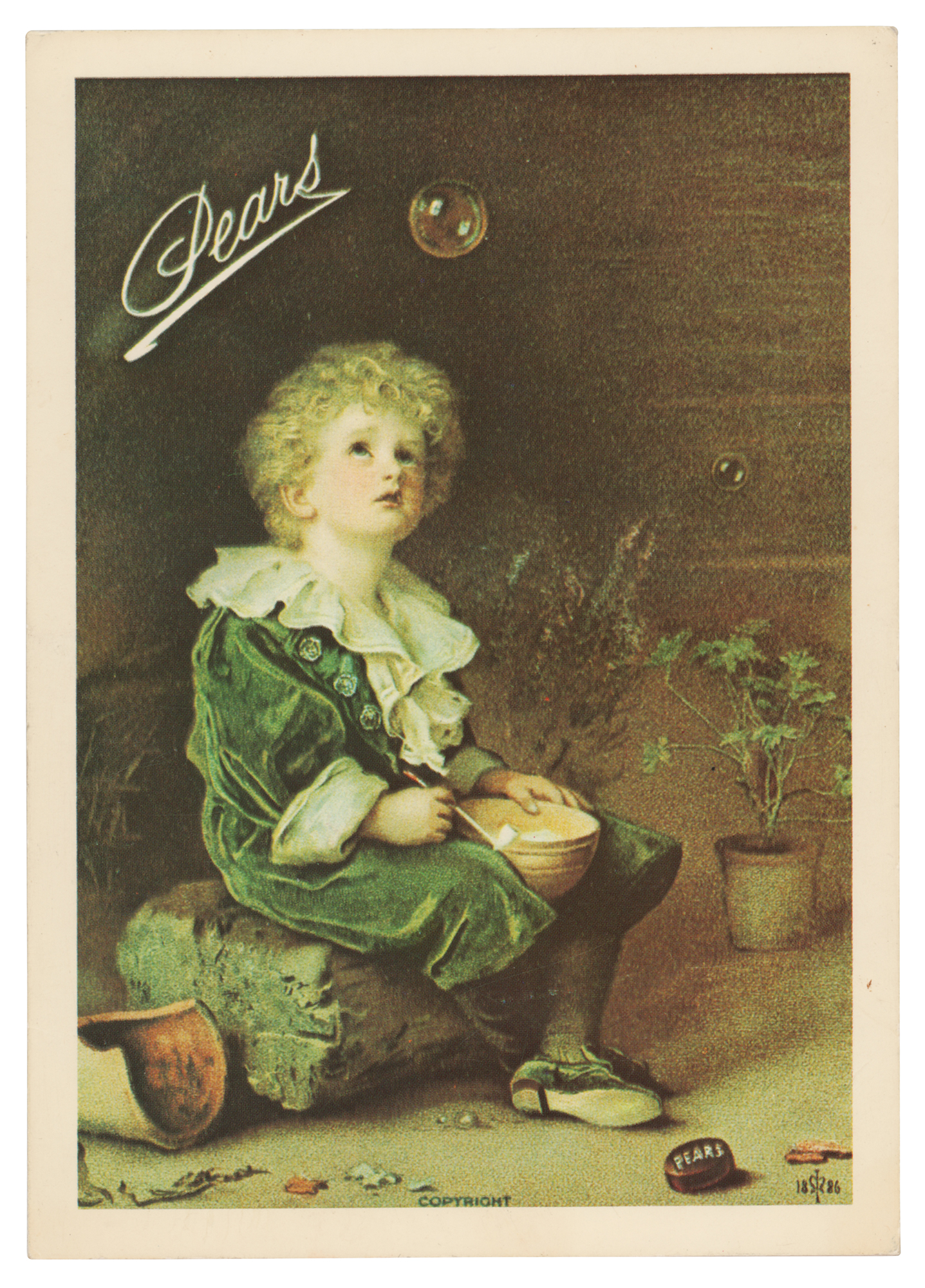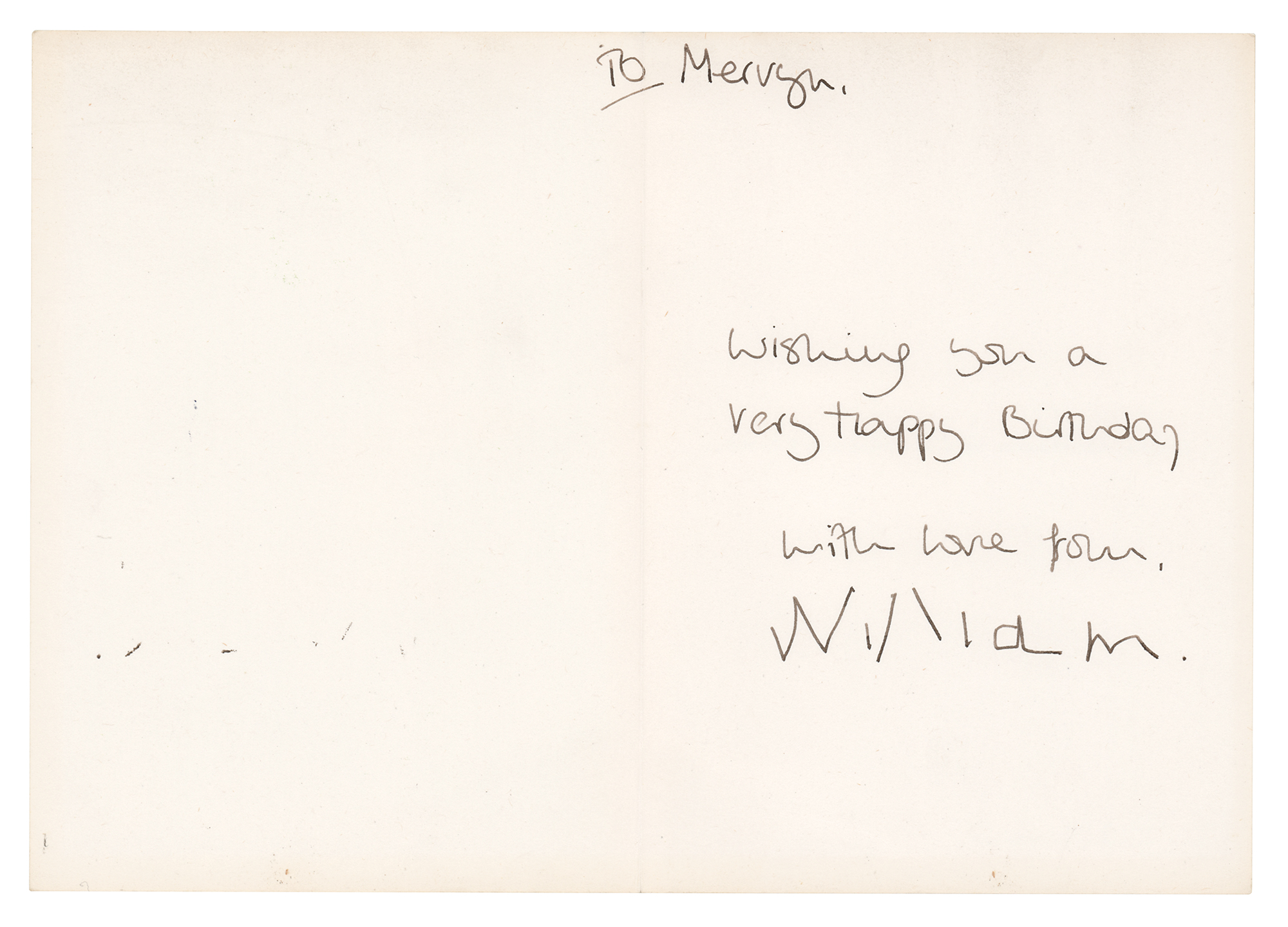 Desirable greeting card featuring the famous 'Bubbles' painting by John Everett Millais, measuring 5 x 7 closed, featuring a handwritten note inside by Princess Diana, "To Mervyn, Wishing you a very happy birthday, with love from," and signed by the very young Prince William at age four or five, "William." In fine condition. Accompanied by a full letter of authenticity from JSA.