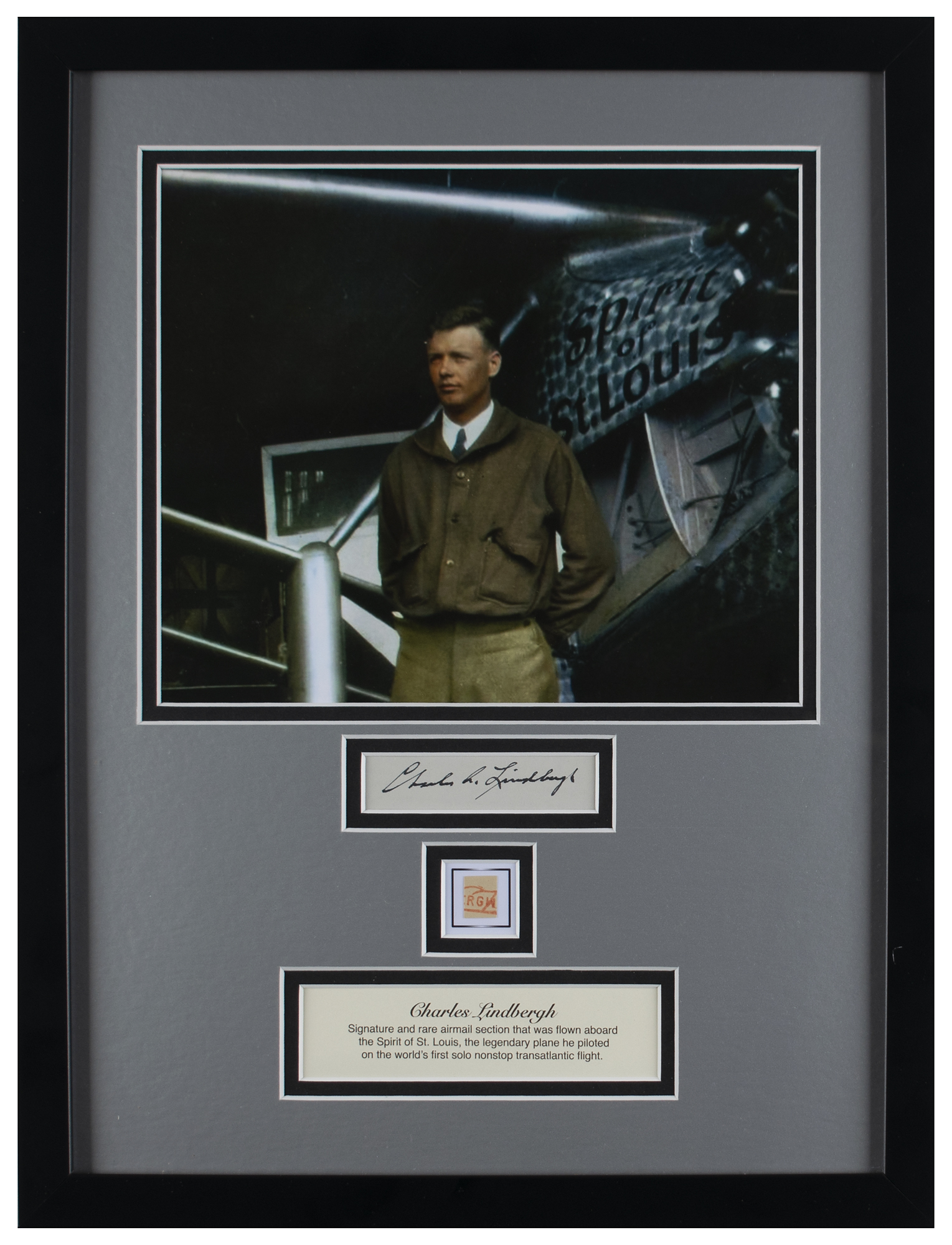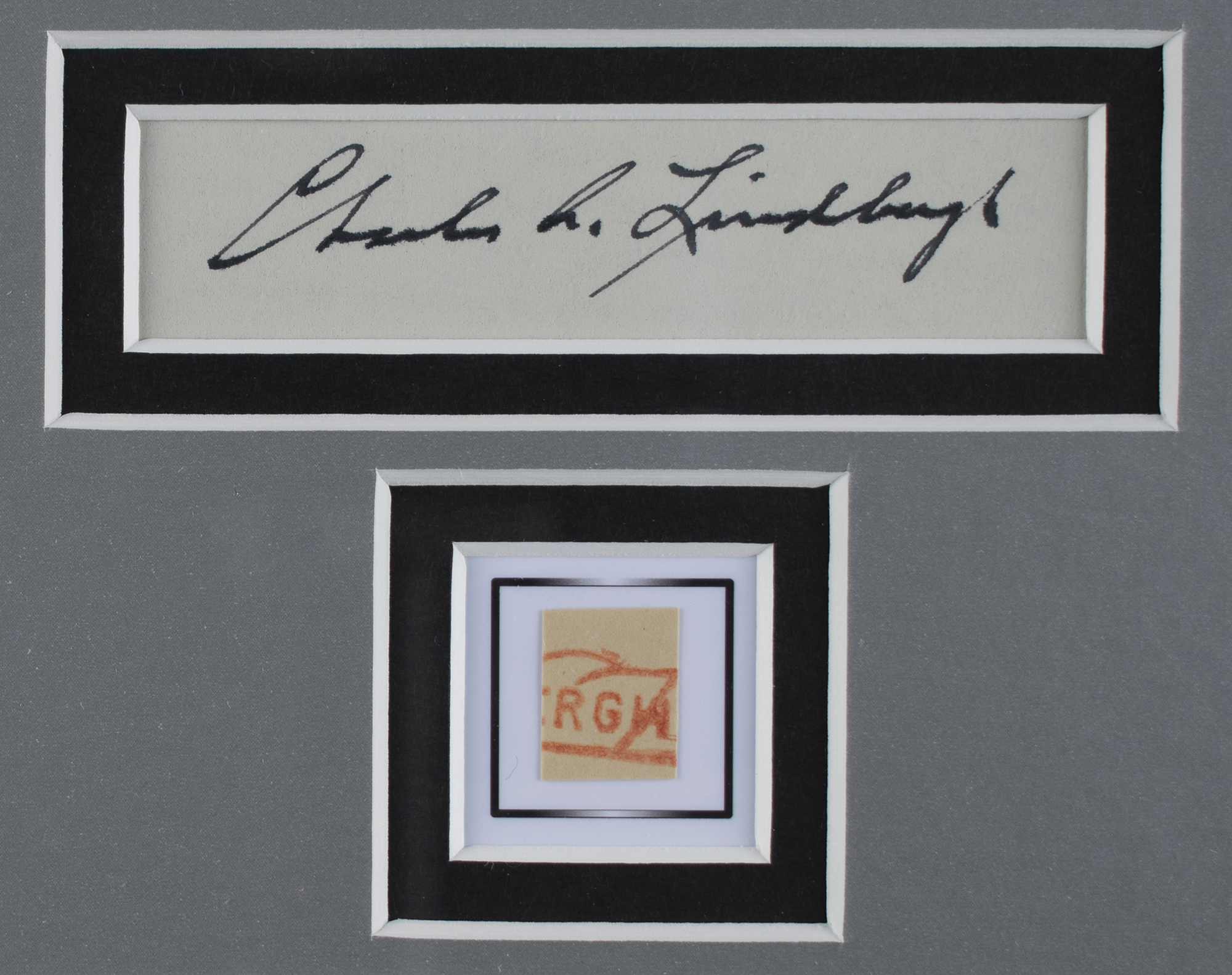 Bold ink signature, "Charles A. Lindbergh,” on an off-white 3.25 x .75 slip, double-matted with a portrait and a section of an airmail envelope flown on the Spirit of St. Louis. Framed to an overall size of 13 x 17. In fine condition. Accompanied by a full letter of authenticity from JSA.
