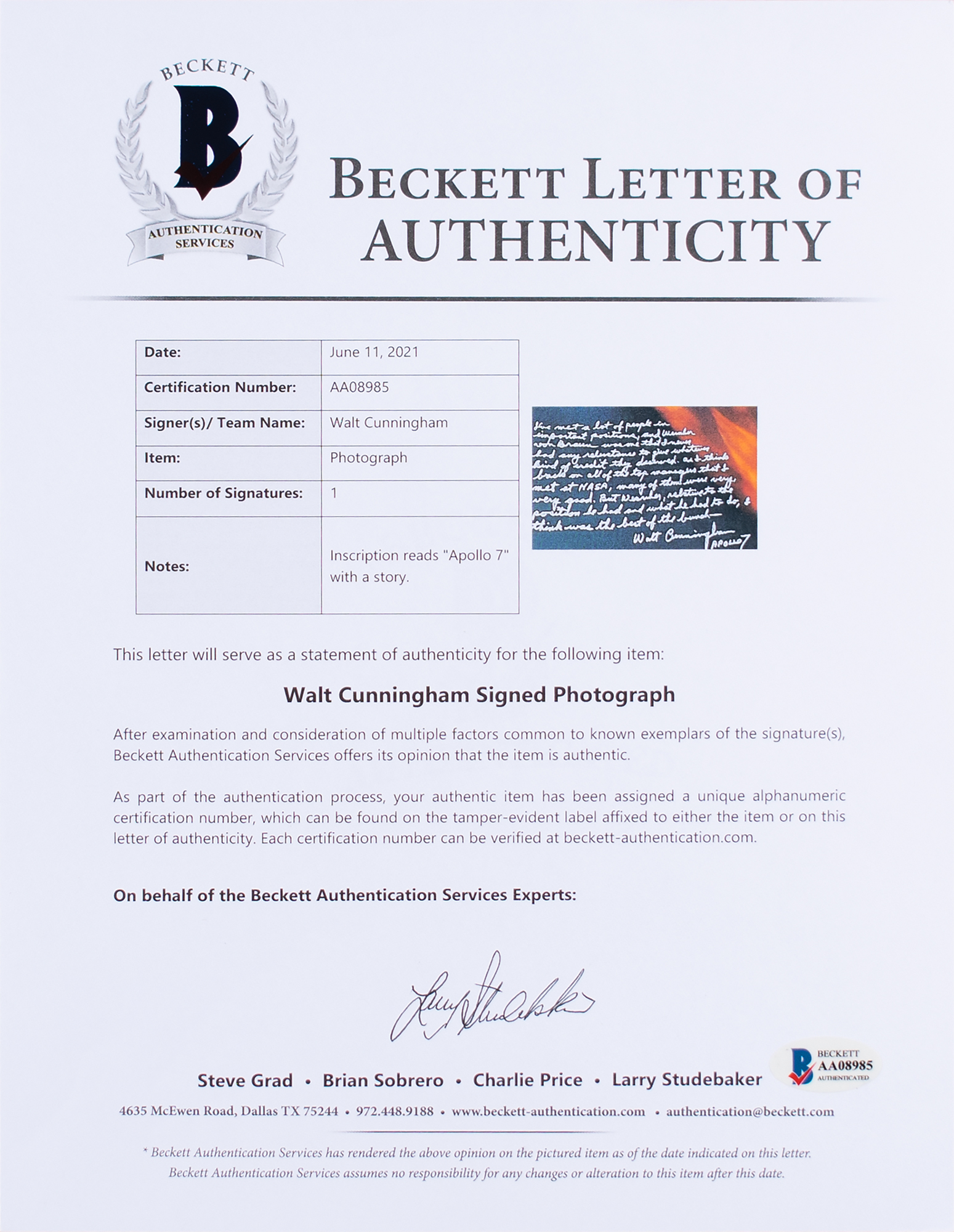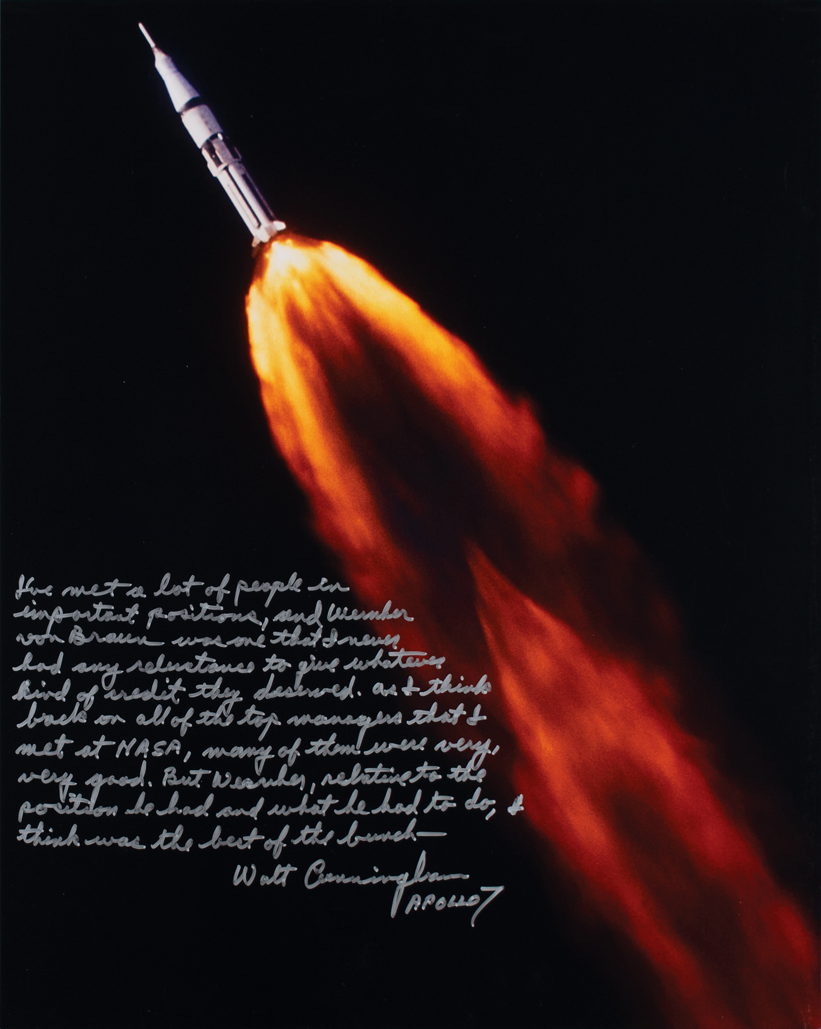 Color glossy 16 x 20 photo of a Saturn IB SA-205 rocket carrying the crew of Apollo 7 into low Earth orbit, signed in silver ink, "Walt Cunningham, Apollo 7," who adds above: "I've met a lot of people in important positions and Wernher von Braun was one that I never had any reluctance to give whatever kind of credit they deserved. As I think back on all of the top managers that I met at NASA, many of them were very, very good. But Wernher, relative to the position he had and what he had to do, I think was the best of the bunch—." In fine condition. Accompanied by a full letter of authenticity from Beckett Authentication Services. A beautiful Apollo 7 launch photo elevated by Cunningham's glowing praise for the chief architect of the Saturn V rocket, the launch vehicle that propelled the Apollo spacecraft to the moon.