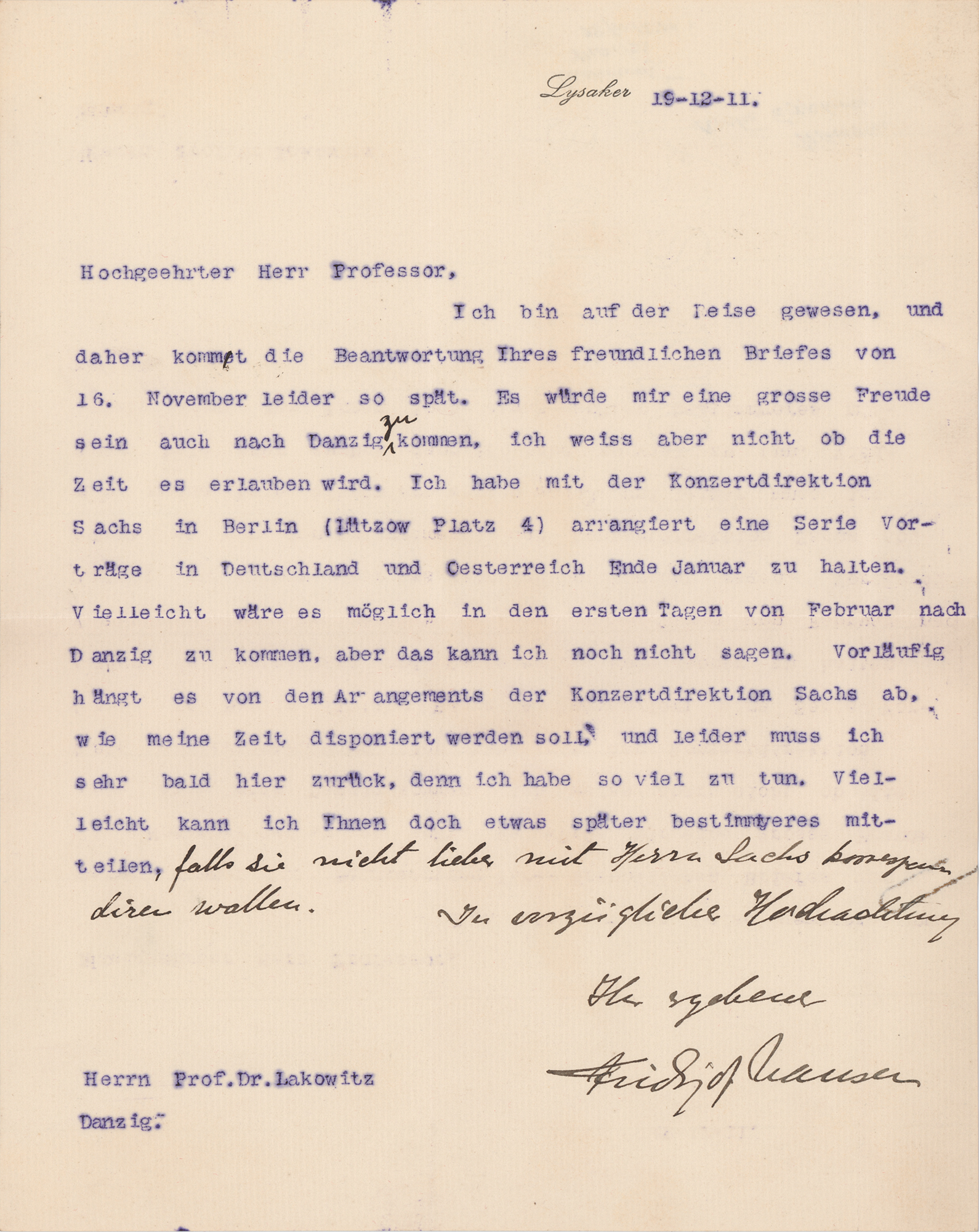 Norwegian explorer, scientist, diplomat, humanitarian, and Nobel laureate (1861-1930) who led the first crossing of the Greenland interior in 1888. TLS in German, one page, 7.75 x 9.75, December 19, 1911. Untranslated letter by Nansen, with a two-line handwritten postscript. In fine condition.