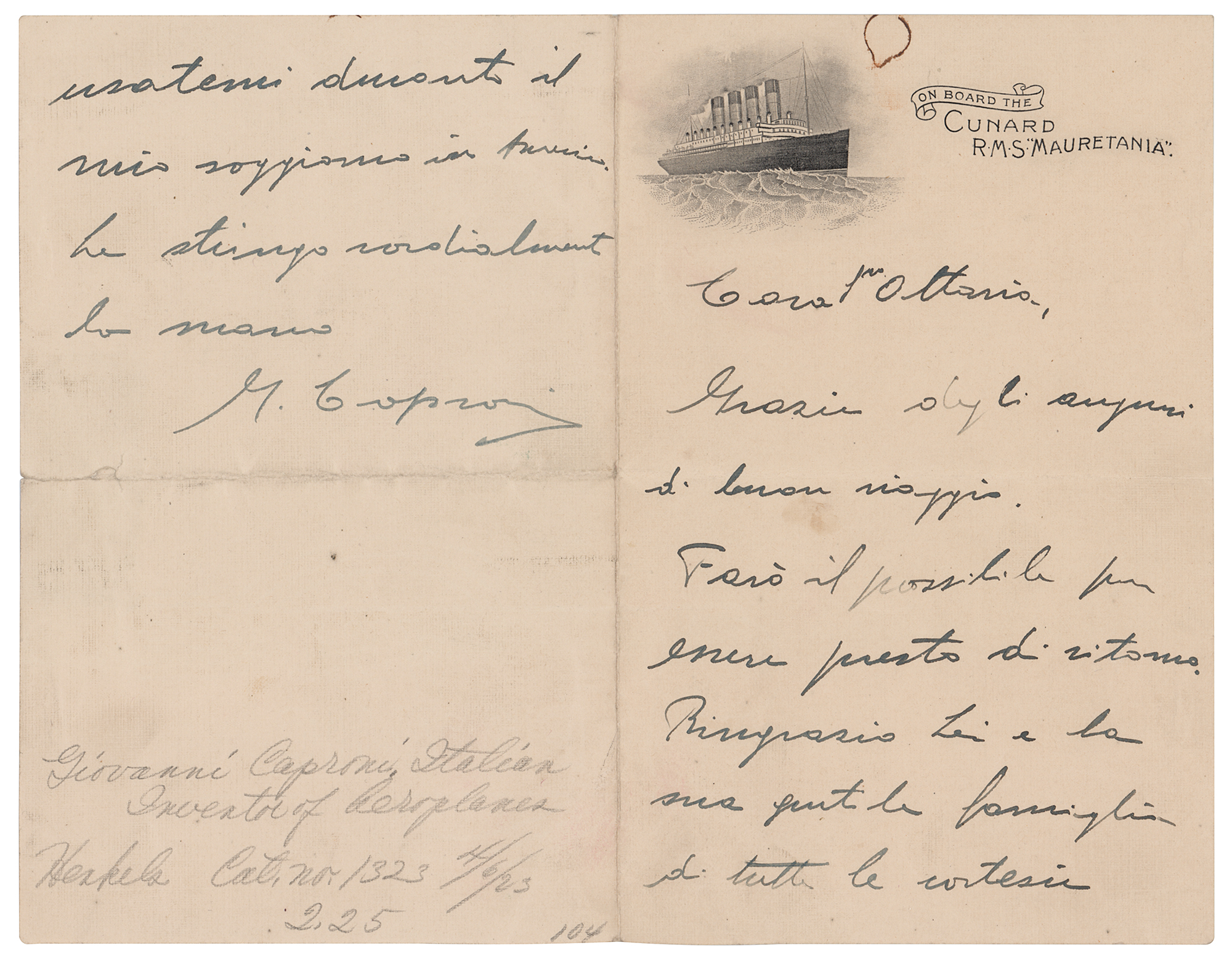 Pioneering Italian aeronautical engineer and aircraft designer (1886-1957) who founded the Caproni aircraft-manufacturing company. ALS in Italian, signed “G. Caproni,” two pages on two adjoining sheets, 4.5 x 7, RMS Mauretania letterhead, no date. Untranslated handwritten letter written on board the famous ocean liner. In fine condition, with an old repair to a fold split on the second page, and a small rusty paperclip impression to the top edge of the first page.