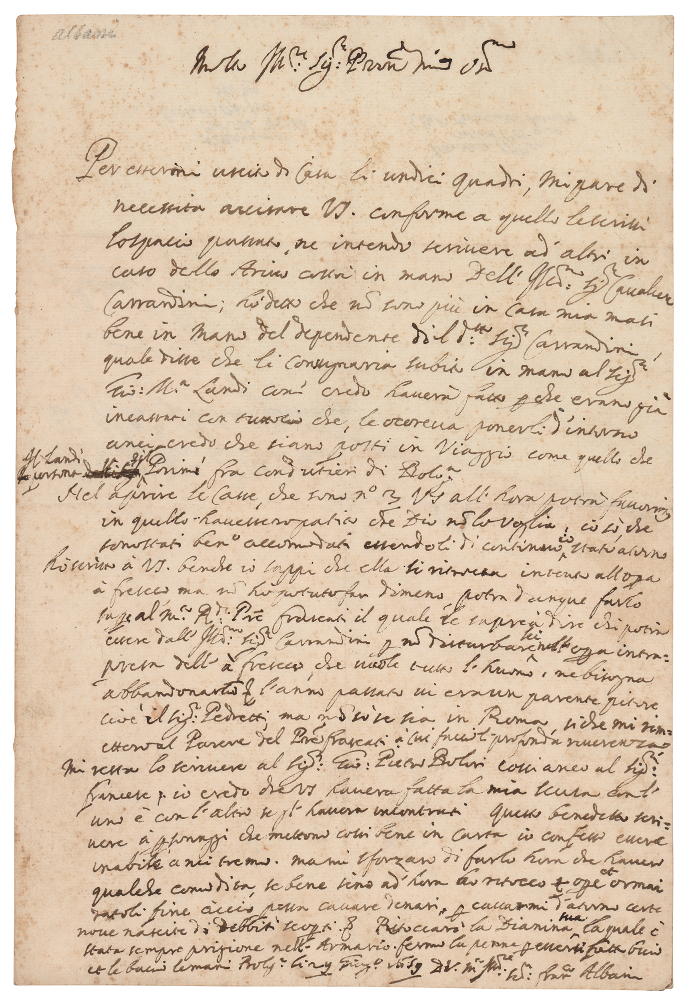 Italian Baroque painter (1578-1660) known for his religious works and mythological frescoes. ALS in Italian, signed “Fran'co Albani,” one page, 7.5 x 11, no date. Untranslated handwritten letter by the celebrated painter. In fine condition, with scattered faint foxing, and roughly half of the integral address leaf torn off and missing.