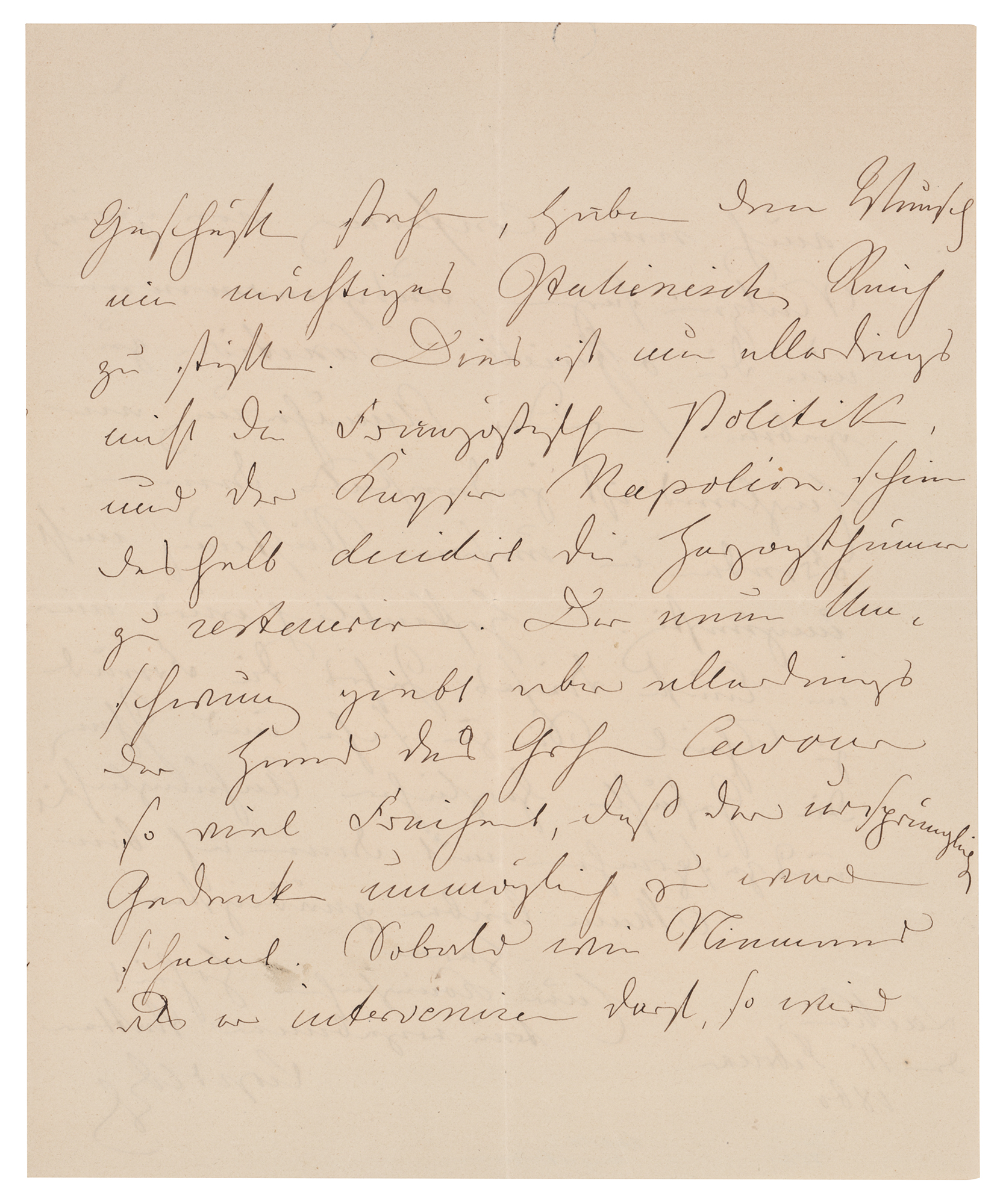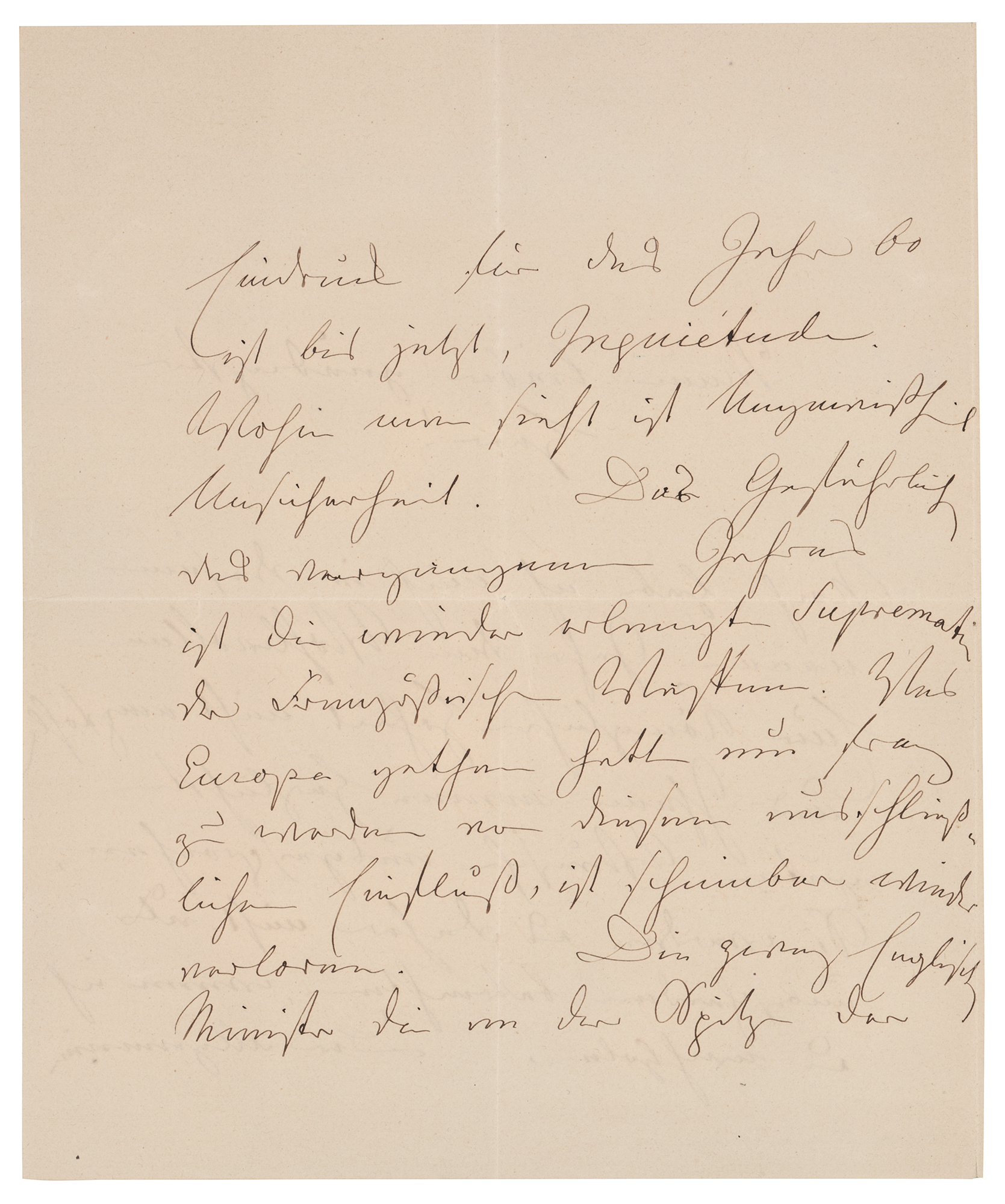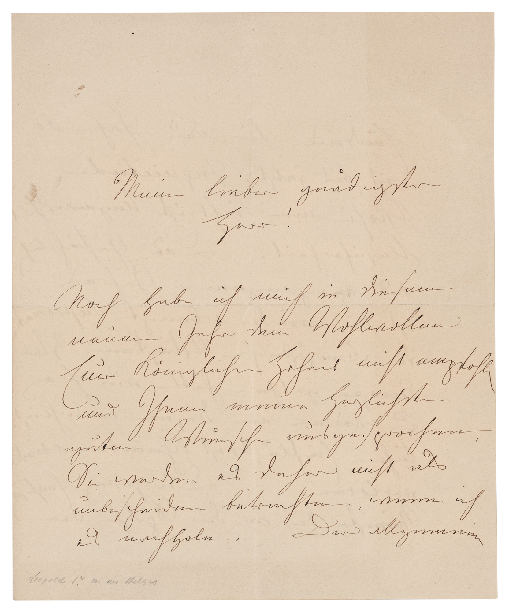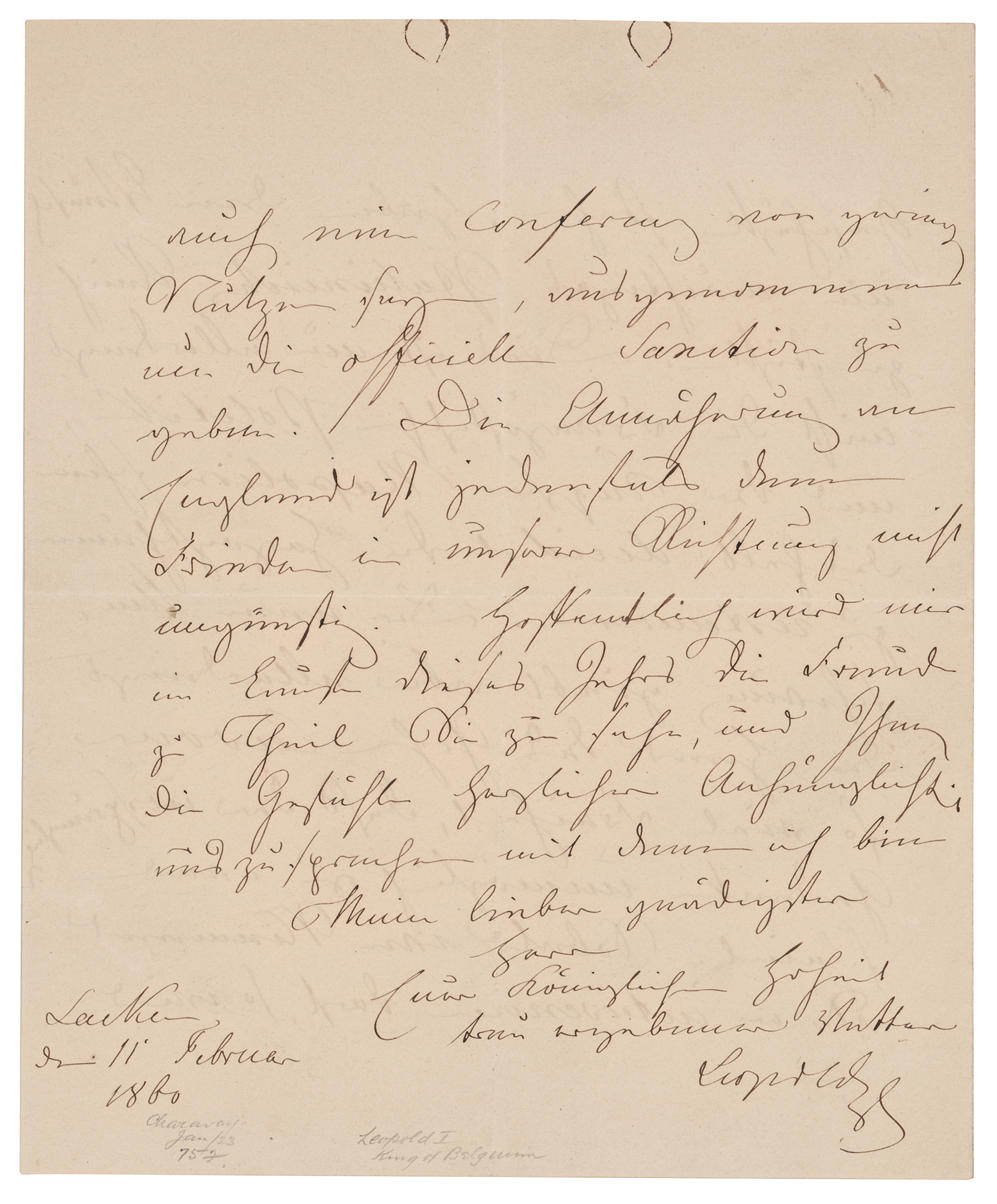 King of Belgium following its independence from the Netherlands (1790-1865). ALS in German, signed “Leopold,” four pages on two adjoining sheets, 7.5 x 9, February 11, 1860. Untranslated letter discussing the state of politics in Europe. In fine condition.