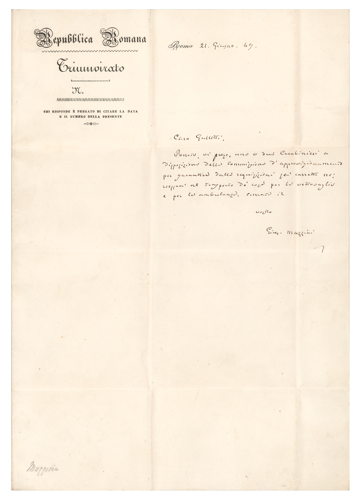 Italian patriot (1805-1872) who dedicated his life, much of which was spent in exile, to uniting his country under a republic. ALS in Italian, signed “Gius. Mazzini,” one page, 8.5 x 12.5, Repubblica Romana letterhead, June 21, 1849. Untranslated handwritten letter to an associate. In fine condition, with heavy intersecting folds. Led by Carlo Armellini, Giuseppe Mazzini, and Aurelio Saffi, the Roman Republic was a short-lived state, declared on February 9, 1849, invaded by the French in April, and disestablished on July 2nd.