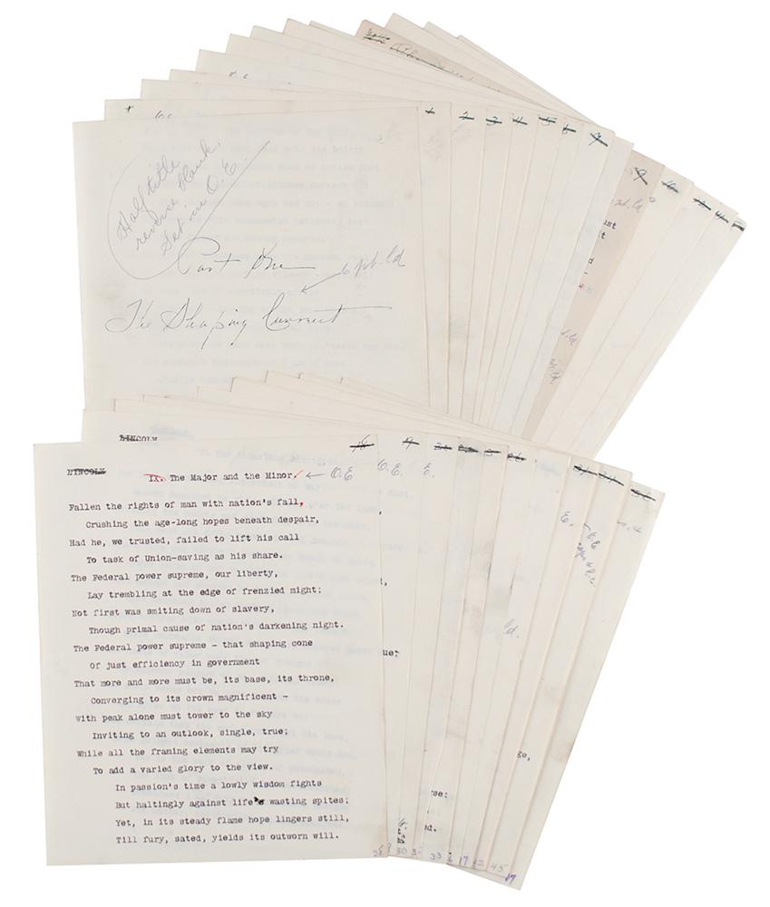 The 39-page typed draft has several of Bell's handwritten emendations throughout, as well as extensive editorial notations. The dramatic verse concludes: "A man, our very own, to earth so near, / So simple in his heartfelt tenderness, / Yet with a vision, piercing heights, a seer, / Tracing the storm clouds and the war's duress. / Seems human life a vain and worthless thing / Attuned by Lincoln to love's deathless spring!"