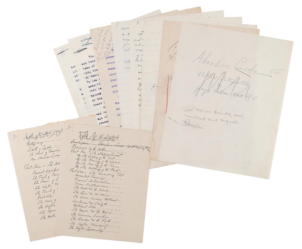 Interesting archive containing the typed draft for George William Bell's manuscript for 'Abraham Lincoln; A Poetical Interpretation,' with a few handwritten pages by Bell (including his draft of the foreword), plus Bell's handwritten letters to the Arthur H. Clark Company regarding the publication of the work. Arthur H. Clark privately published the poem for Bell in 1913 in an edition of 125 copies.