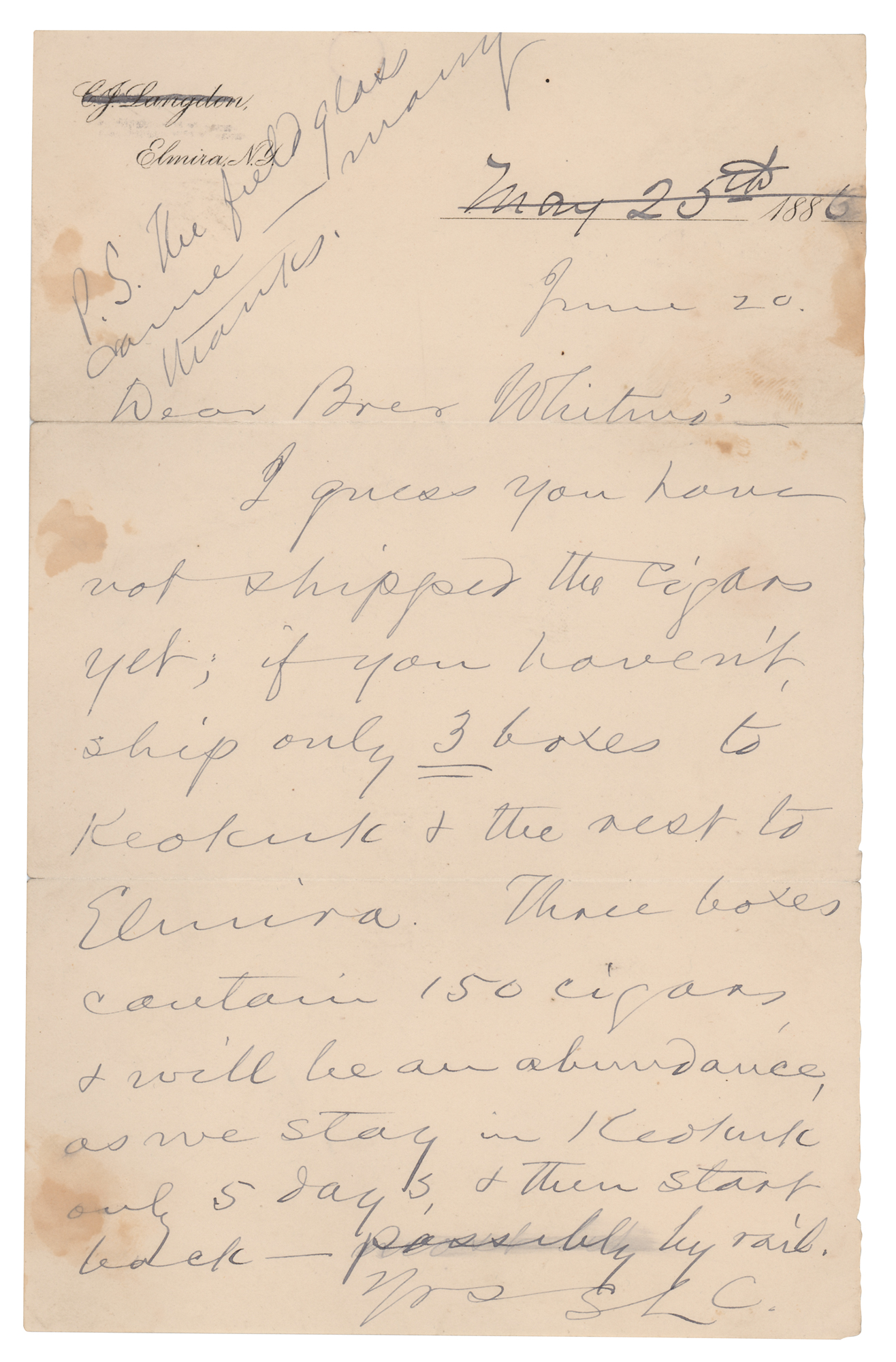 ALS signed “S.L.C.,” one page, 5.25 x 8.5, June 20, 1886. Handwritten letter regarding an order of cigars, in part: "I guess you have not shipped the cigars yet; if you haven't, ship only 3 boxes to Keokuk & the rest to Elmira. Three boxes contain 150 cigars, & will be an abundance as we stay in Keokuk only 5 days, & then start back—possibly by rail." In very good to fine condition, with staining to the side edges, and splitting to the ends of the top fold repaired with archival tape on the back.