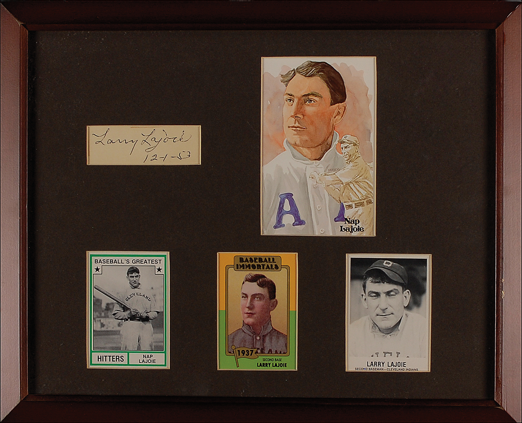 Vintage ballpoint signature, "Larry Lajoie 12-1-53," on an off-white card. Matted and framed with a Perez-Steele card and three trading cards to an overall size of 15.25 x 12.25. In fine condition.