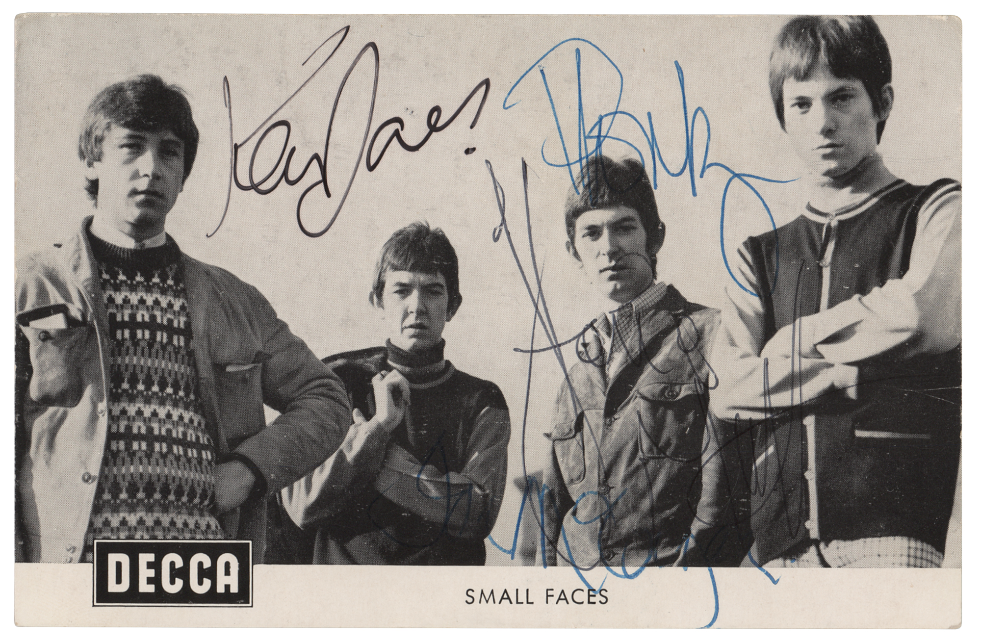 Vintage Decca Records promo card for Small Faces, 5.5 x 3.5, signed on the front in blue and black ink by Stevie Marriott, Ronnie Lane, who signs as "Plonk," Kenney Jones, and Ian McLagan. In fine condition, with a few small creases.
