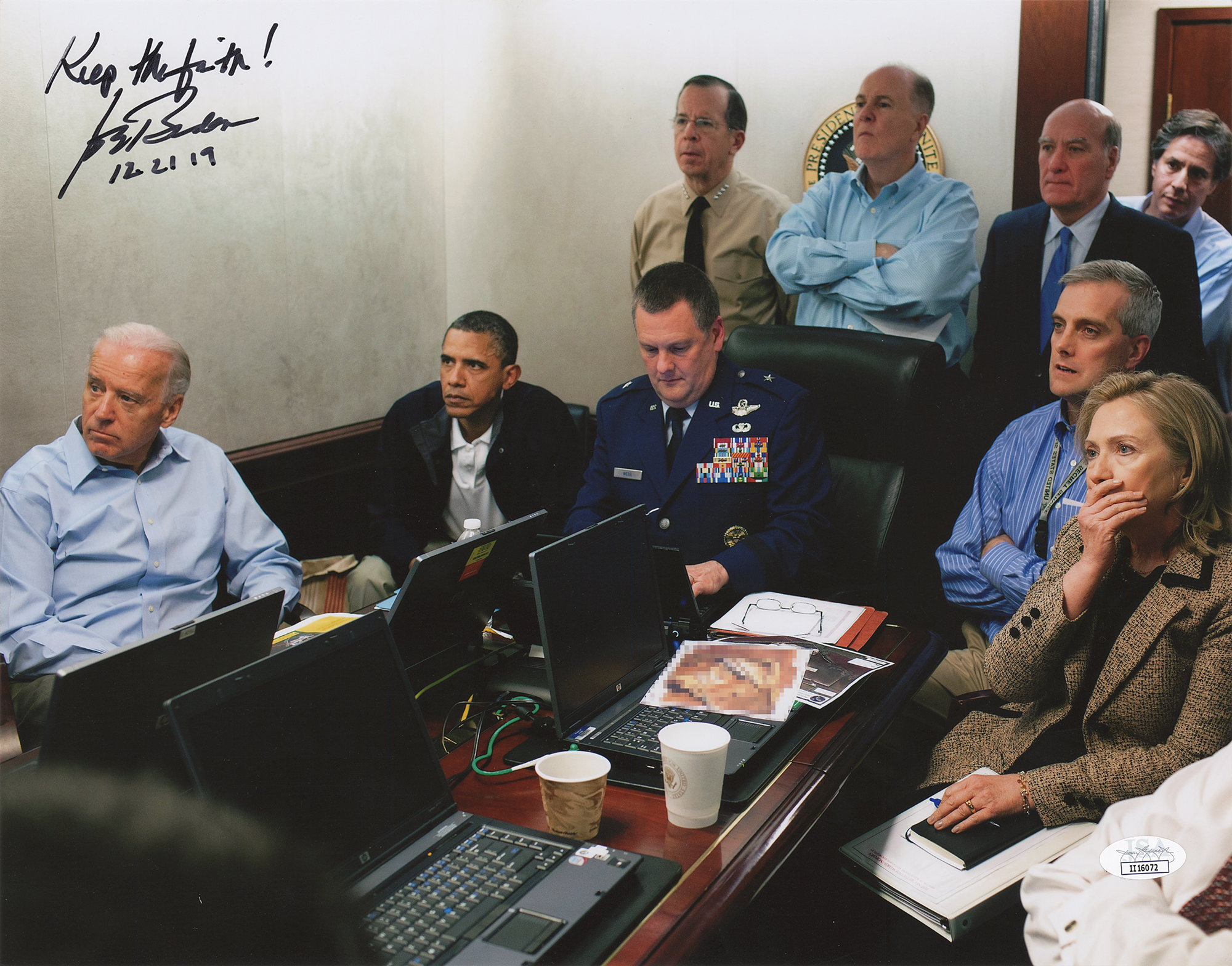 Color satin-finish 14 x 11 photo of President Barack Obama, Vice President Joe Biden, and former Secretary of State Hillary Clinton, along with other members of the national security team, as they receive an update on the mission against Osama bin Laden in the Situation Room of the White House on May 1, 2011, signed in black felt tip, "Keep the faith! Joe Biden,"with another hand adding the date, "12-21-19." In very fine condition, with a JSA label affixed to the lower corner. Accompanied by a letter of authenticity from JSA.